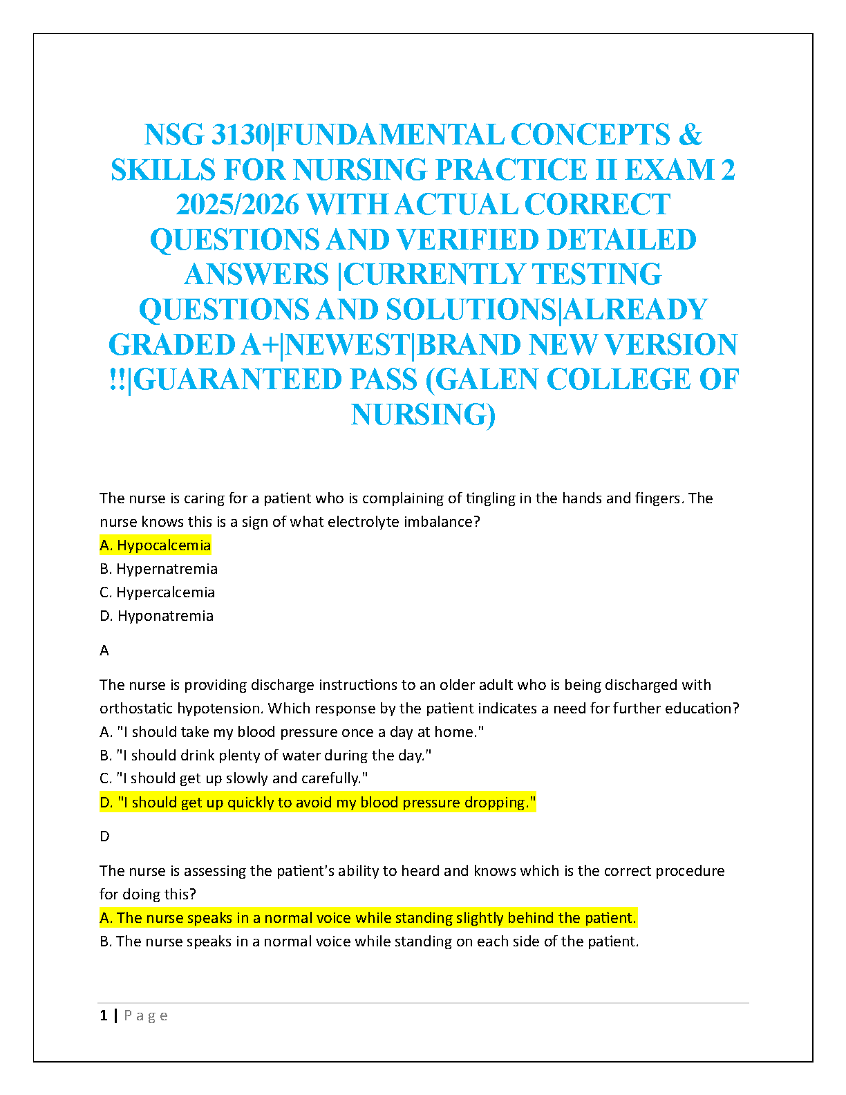 Master your NSG 3130 Exam 2 with this ultimate study resource for Fundamental Concepts & Skills for Nursing Practice II at Galen College of Nursing. This test bank, aligned with Taylor, Lynn & Bartlett's 'Fundamentals of Nursing' 10th Edition, provides the newest, A+ graded collection of questions and meticulously verified answers for the 2025/2026 academic year. Gain the confidence you need with detailed solutions that clarify complex topics, ensuring you're fully prepared to pass your exam with flying colors and avoid resits.