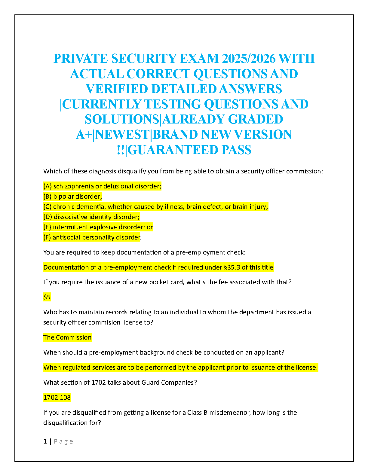 Ace your security officer licensing exam on the first try with our comprehensive Private Security Exam 2025/2026 Test Bank. This premium study resource features a complete collection of the latest, A+ graded questions and meticulously verified answers. Drawn from current testing materials, this guide provides the detailed solutions you need to understand the concepts and pass with confidence. Don't leave your certification to chance—prepare with the best and guarantee your success.