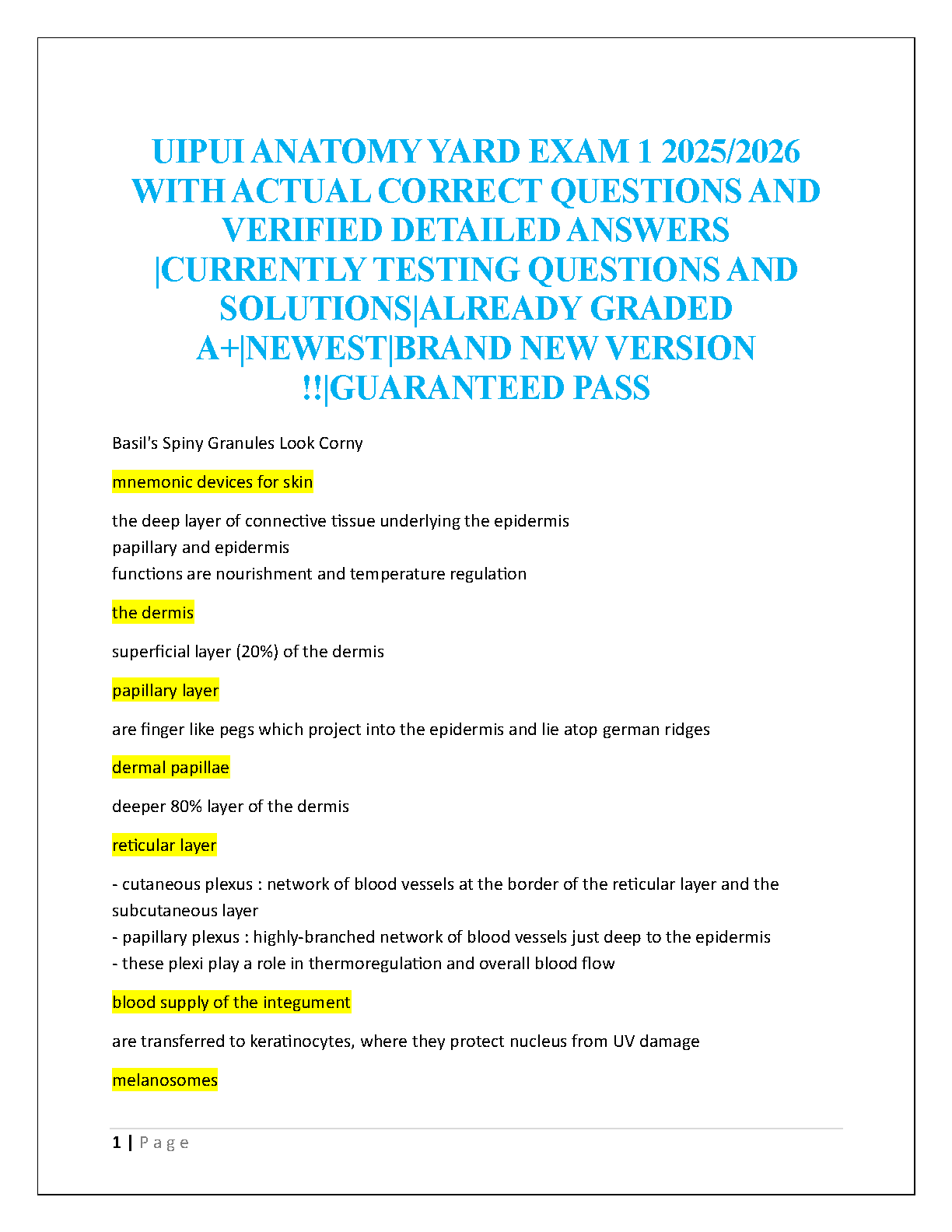 Excel in your anatomy course with the ultimate study resource for the UIPUI Anatomy Yard Exam 1. This 2025/2026 test bank is meticulously compiled with currently tested questions and verified, detailed answers to ensure you have the most accurate and relevant material. Covering key topics like the integumentary system and more, this guide provides everything you need to study effectively. Boost your learning with helpful mnemonics and gain the confidence to ace your exam. Perfect for students aiming for an A+ and a guaranteed pass on their first attempt. Download now and take the stress out of studying for your anatomy practical!