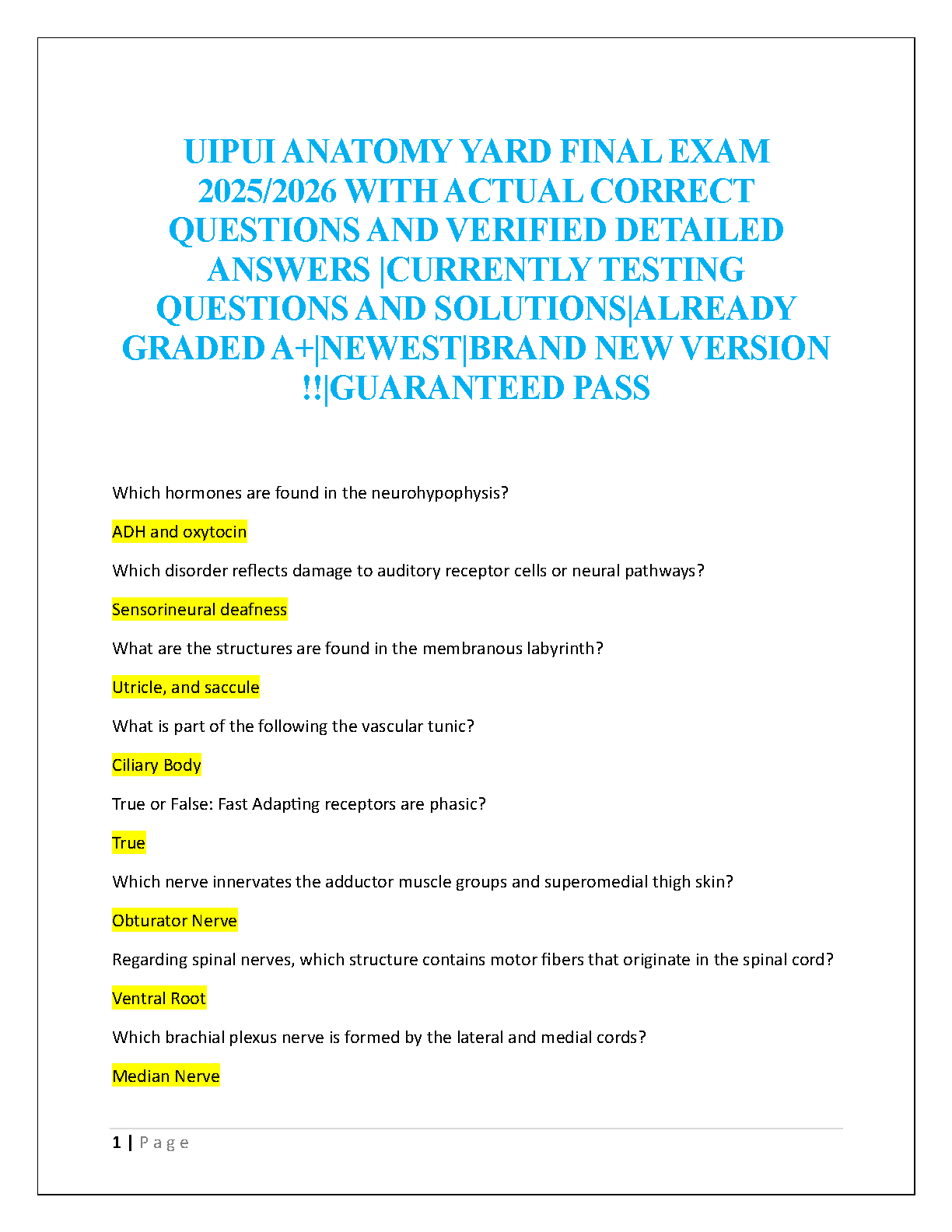 Ace your IUPUI Anatomy Yard Final Exam with our latest 2025/2026 test bank! This comprehensive study guide is packed with actual exam questions and meticulously verified, detailed answers. Sourced from the most current testing materials, this resource is already graded A+ and is designed to guarantee your success. Stop worrying about resits and secure the top grade you deserve. Master complex anatomy concepts and walk into your final exam with confidence. Download now to pass on your first attempt!