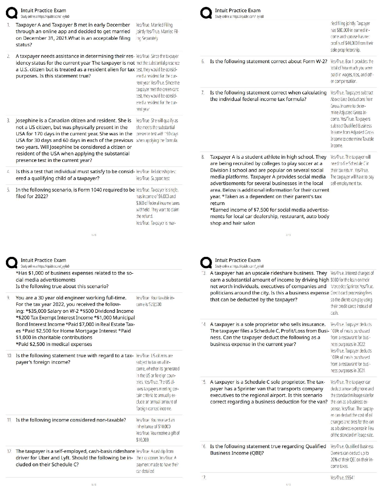 Unlock your potential and guarantee your success on the Intuit federal tax certification exam with our comprehensive Test Bank. This essential study resource, tailored for the 2023 exam season (covering the 2022 tax year), provides an extensive collection of practice questions and detailed answers. Dive deep into crucial topics such as determining filing status, residency tests, qualifying child rules, Schedule C for business income, deductible expenses, and Qualified Business Income (QBI). Each question is designed to mirror the actual exam, helping you build confidence and master the material efficiently. Stop worrying about resits—prepare effectively with this test bank and pass your exam on the first attempt!