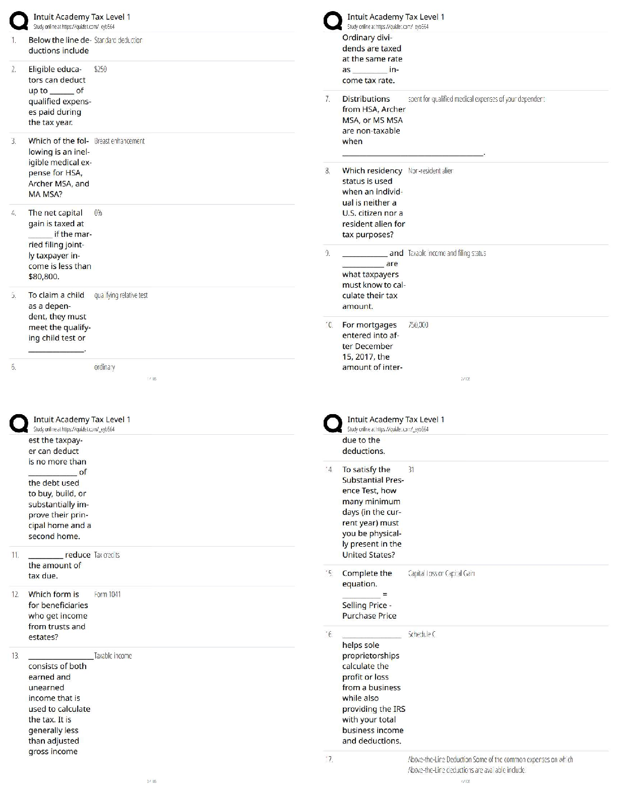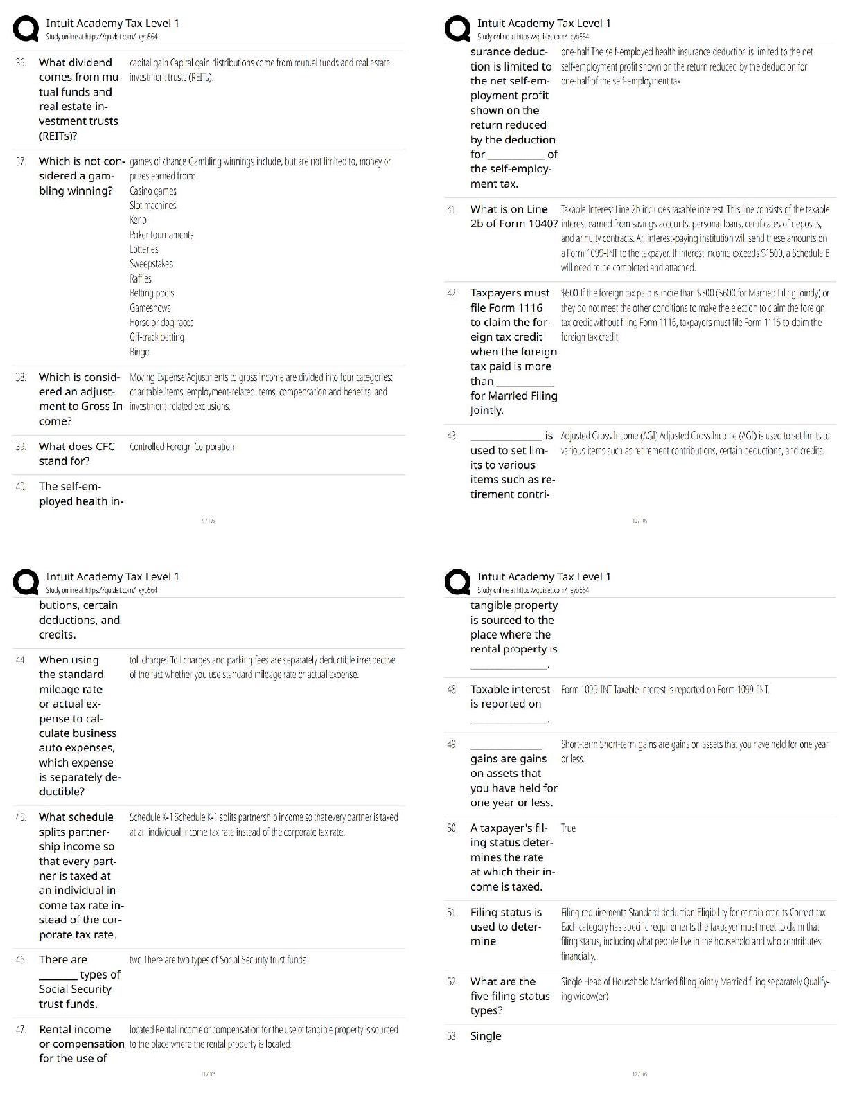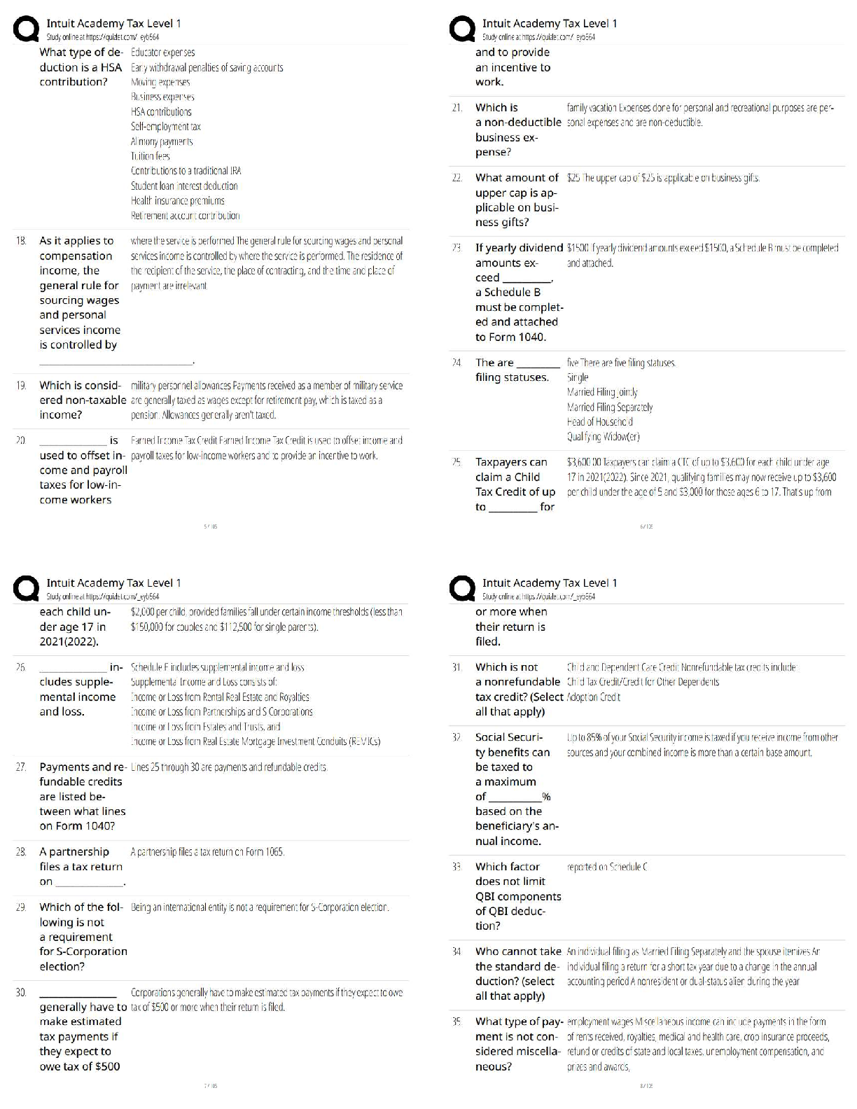 Ace your Intuit Academy Tax Level 1 certification exam with this comprehensive and verified test bank. This essential study resource provides a complete collection of real exam questions and detailed, accurate answers, covering all core topics like deductions, income types, capital gains, tax credits, and filing statuses. Designed to help you master the material efficiently, this test bank is your key to passing the certification on your first attempt. Download now to gain the confidence and knowledge needed to excel.