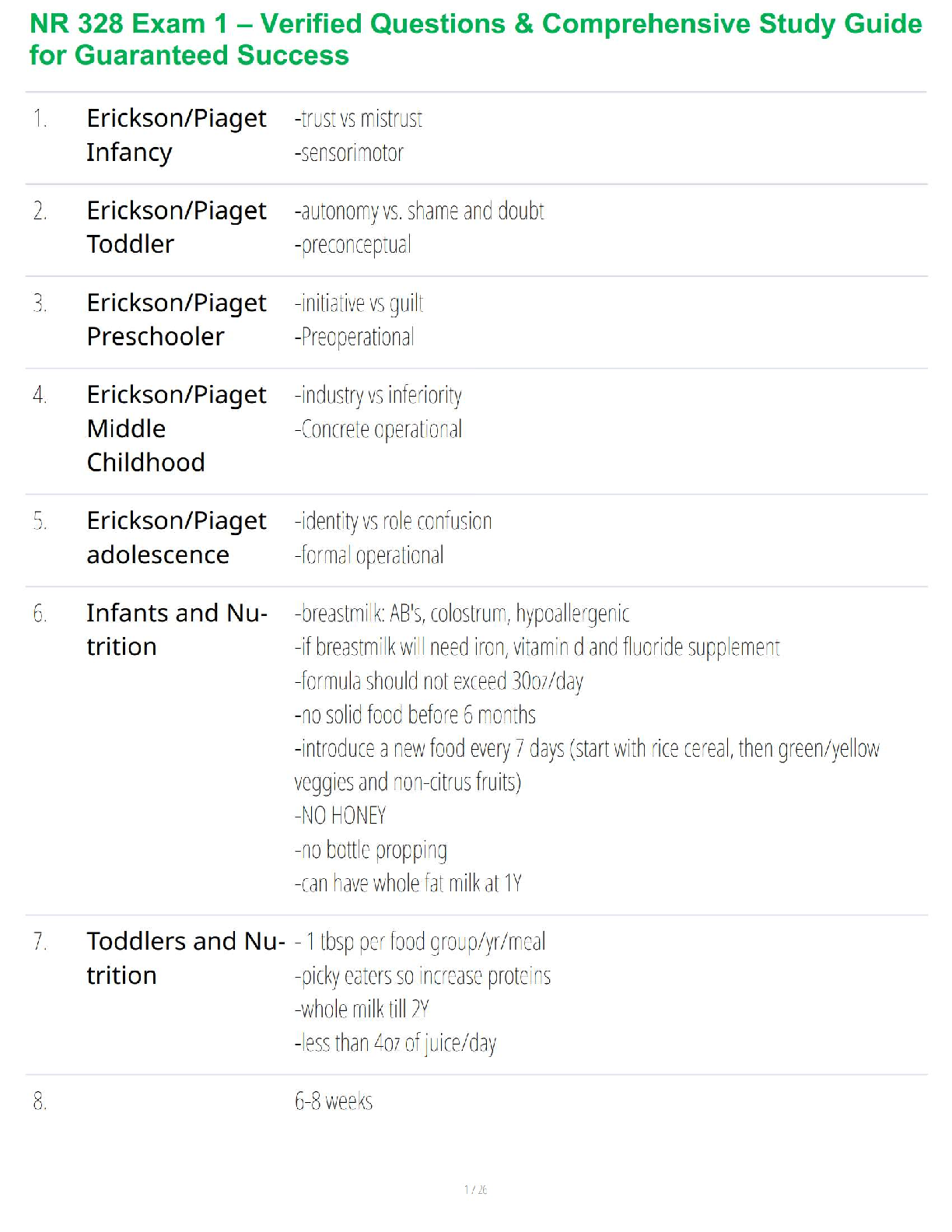 Unlock exam success with our comprehensive study guide for NR 328 Exam 1. This meticulously prepared resource for the 2025/2026 academic year covers all essential topics, including detailed notes on Erickson and Piaget's developmental stages from infancy to adolescence, and crucial guidelines on infant and toddler nutrition. Featuring verified questions and in-depth explanations, this guide is your ultimate tool to master the course material, build confidence, and pass your exam on the very first attempt. Say goodbye to exam stress and hello to guaranteed success!