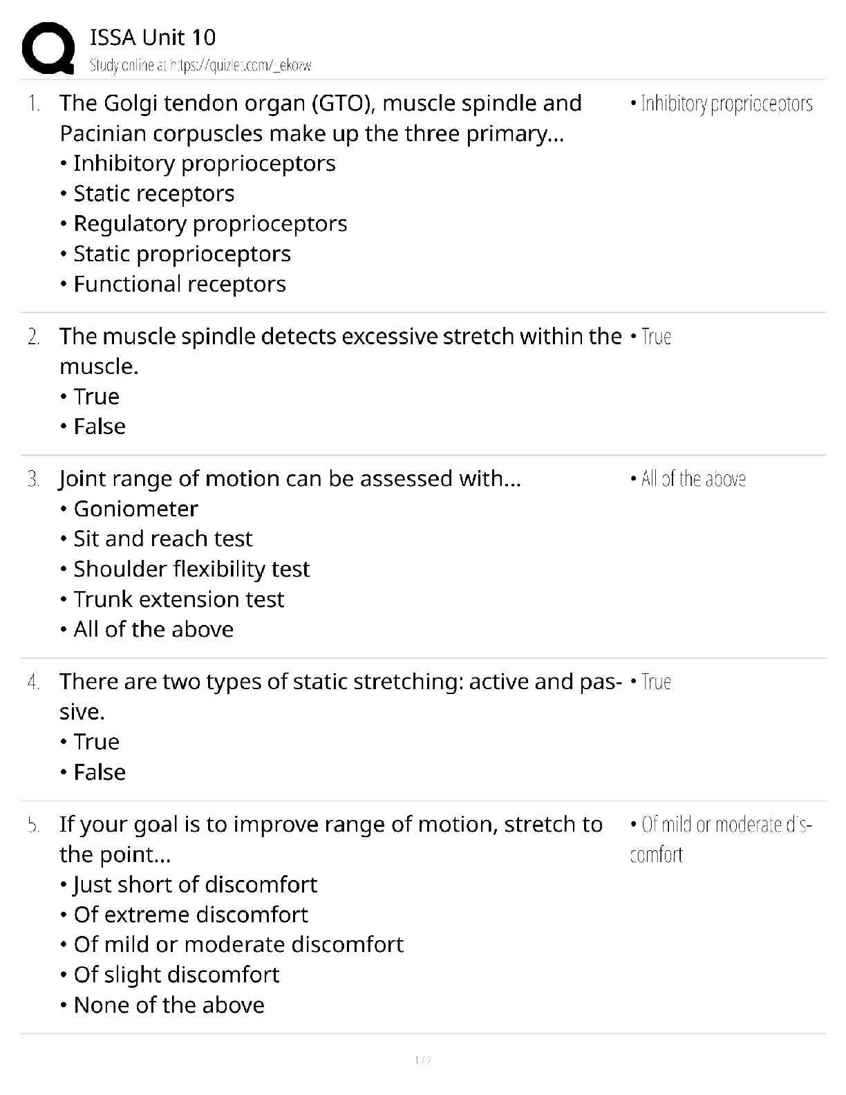Ace your ISSA Certified Personal Trainer exam with this comprehensive test bank for Unit 10, focusing on Flexibility Training. This essential study guide provides a complete set of exam-style questions and verified answers, covering all critical topics such as proprioceptors, methods for assessing range of motion, and the science behind effective stretching techniques. Designed to help you master the course material and build confidence, this resource is your key to passing the ISSA CPT certification exam on your first attempt. Stop stressing and start studying smarter with our targeted Unit 10 test bank.
