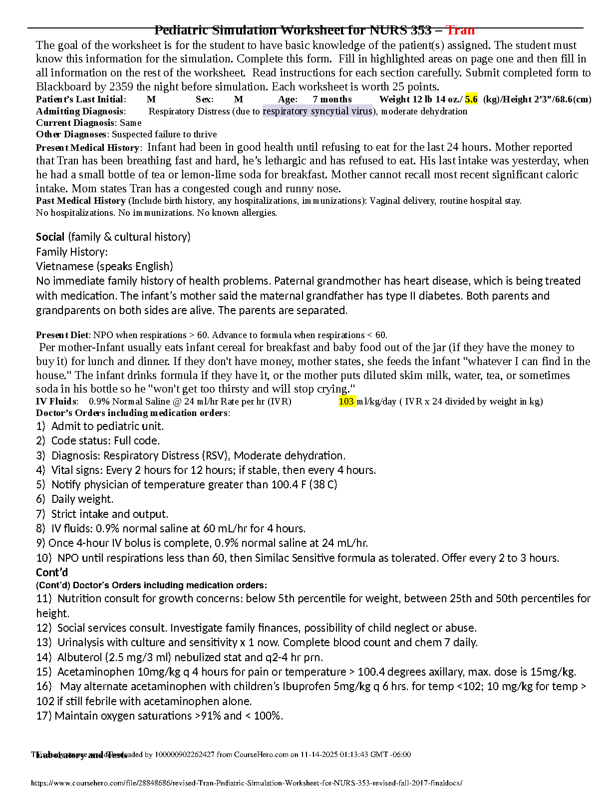 Master your pediatric nursing course with this detailed NURS 353 simulation worksheet. This comprehensive case study focuses on Tran, a 7-month-old infant diagnosed with Respiratory Distress from RSV, moderate dehydration, and suspected failure to thrive. This resource provides a complete patient workup, including history, social factors, and a full list of doctor's orders for treatment. This updated 2025/2026 guide is the ultimate tool to enhance your clinical reasoning and help you pass your pediatric nursing exams on the first attempt.