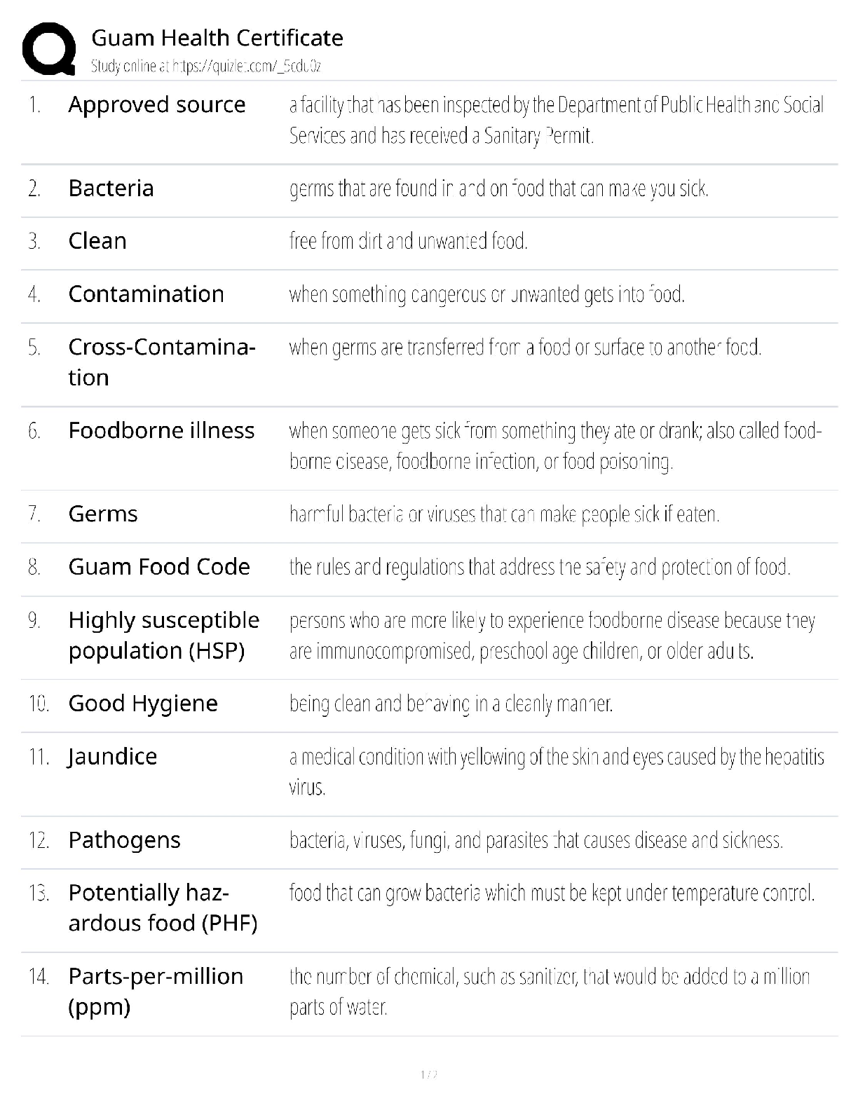 Get ready to ace your Guam Health Certificate exam with our comprehensive 2025/2026 study guide! This essential resource is specifically designed for aspiring food handlers in Guam, providing all the critical information you need to pass your certification test on the very first try. Our guide breaks down key concepts into easy-to-understand definitions, covering everything from foodborne illness and cross-contamination to proper hygiene and the Guam Food Code. Stop worrying about resits and start your career with confidence. Download now to master the material and secure your Guam Food Handler's Certificate!