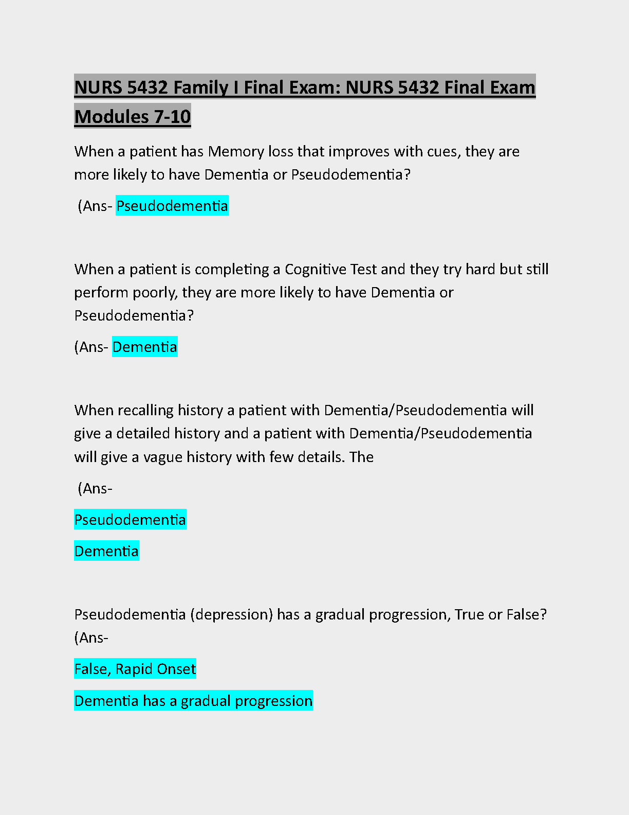 Get ready to excel in your NURS 5432 Family I final exam with this comprehensive study guide for the 2025/2026 academic year. This resource provides detailed questions and correct answers covering Modules 7-10, focusing on critical topics such as the clinical differentiation between Dementia and Pseudodementia. This guide is expertly crafted to help you grasp complex concepts, boost your confidence, and pass your exam on the first attempt, avoiding costly resits.