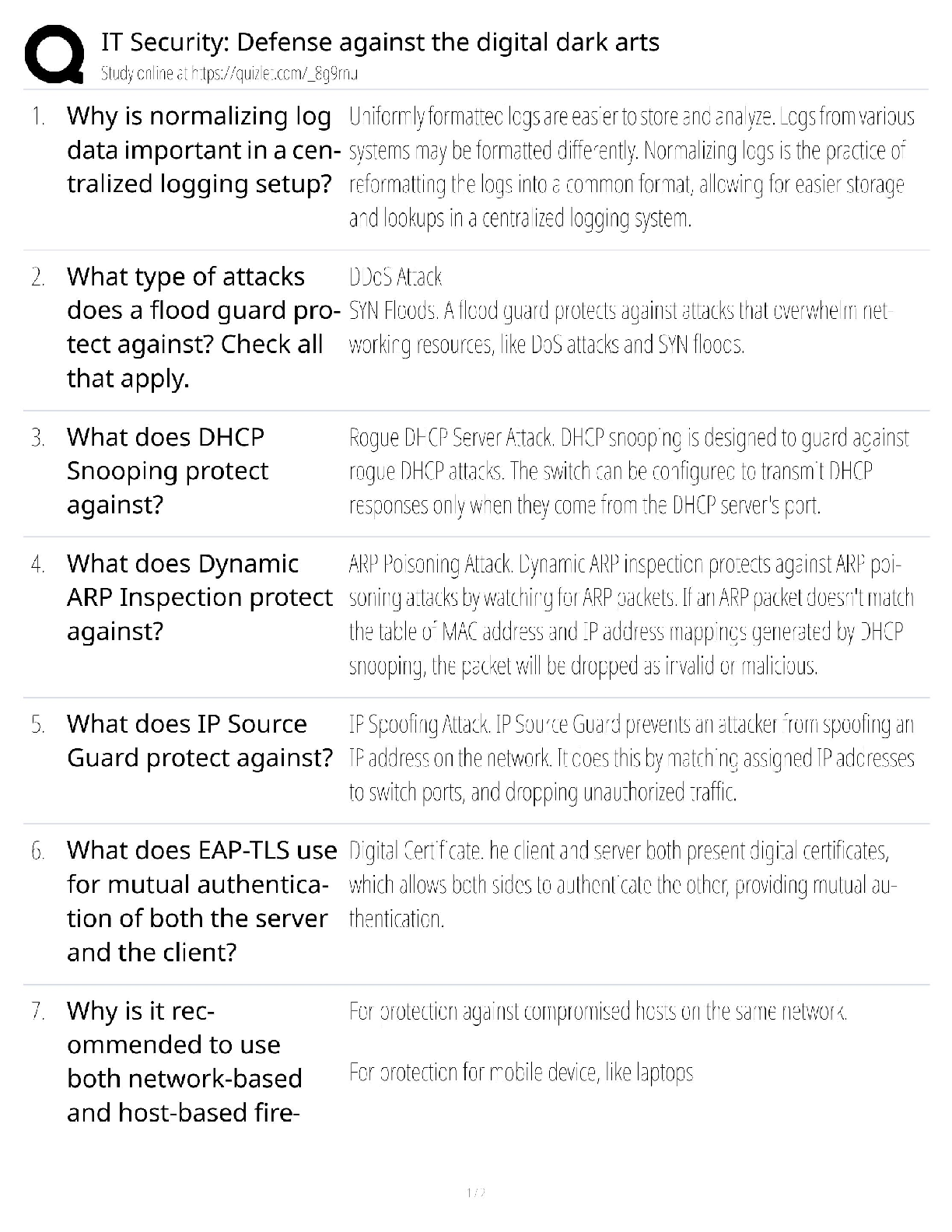 Ace your IT Security exams with this comprehensive test bank for 'Defense Against the Digital Dark Arts.' This study guide provides a complete set of questions and expertly verified answers, covering critical cybersecurity topics. Master concepts like DHCP Snooping, Dynamic ARP Inspection, IP Source Guard, Flood Guards for DDoS protection, EAP-TLS authentication, and the strategic use of firewalls. Each answer is clearly explained to ensure deep understanding. Download now to get the essential preparation tool you need to pass your exam with confidence and excel in your cybersecurity course.