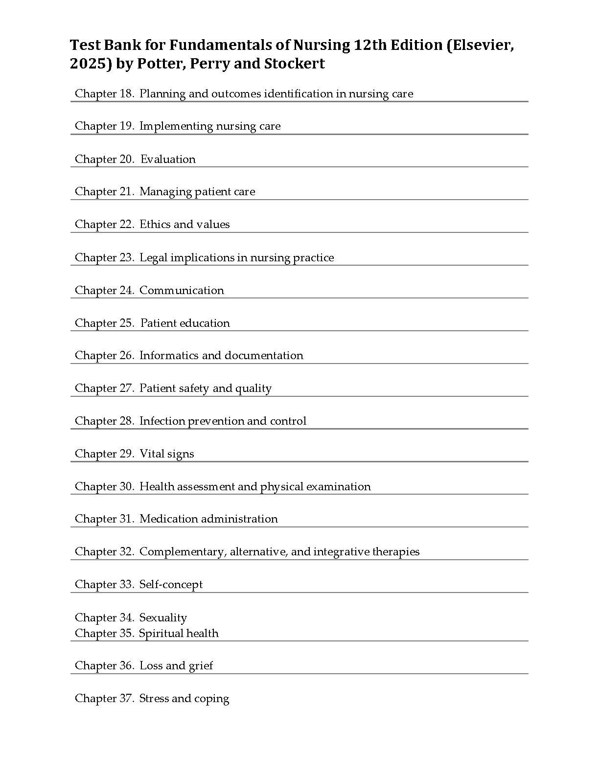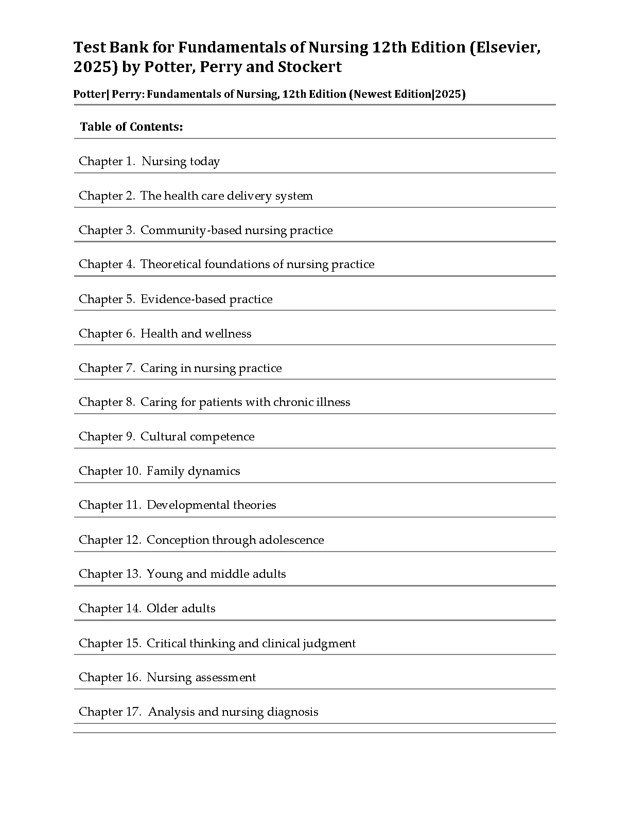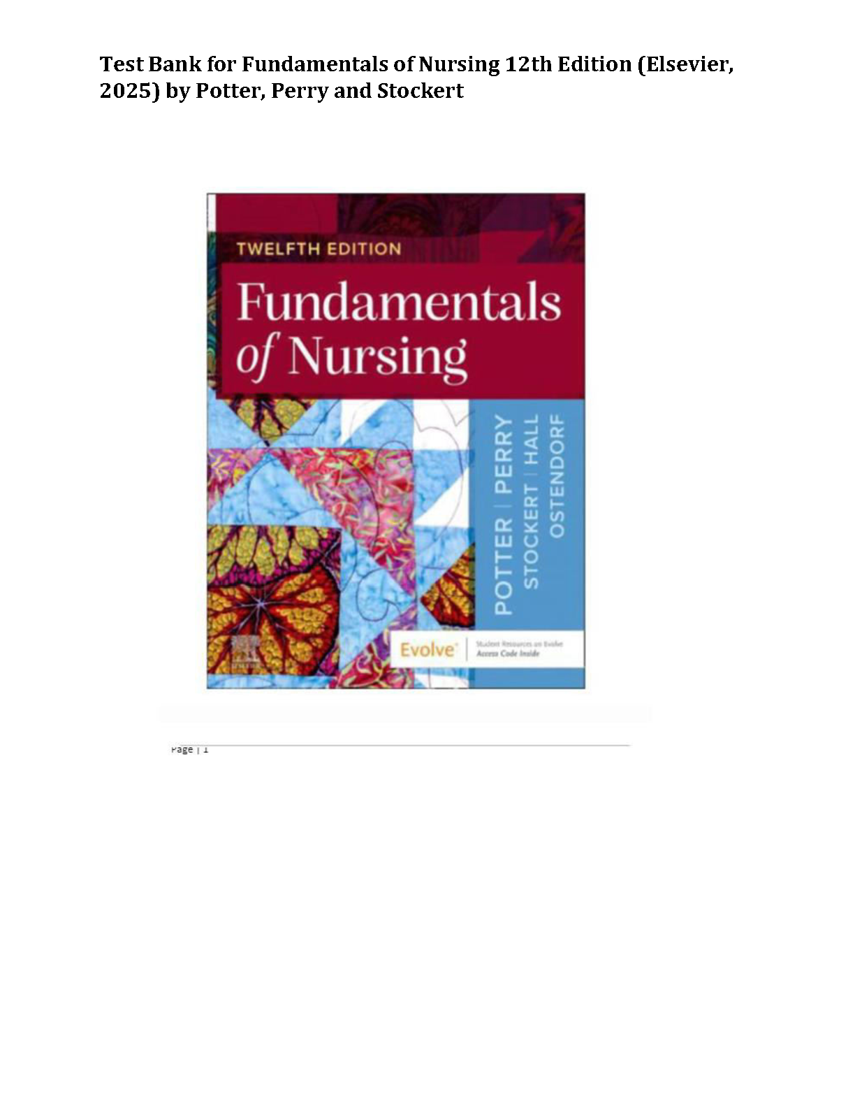 Prepare to excel in your nursing studies with the comprehensive Test Bank for Fundamentals of Nursing, 12th Edition, authored by Potter, Perry, Stockert, Hall, and Ostendorf. This essential study aid, updated for 2025, provides an extensive collection of exam-style questions, including multiple-choice, fill-in-the-blank, and critical thinking scenarios, covering all key concepts from the textbook. It's the perfect tool for students aiming to test their knowledge, reinforce learning, and gain the confidence needed to pass their exams on the first attempt. Get immediate access to this invaluable resource and start your journey to academic success in nursing.