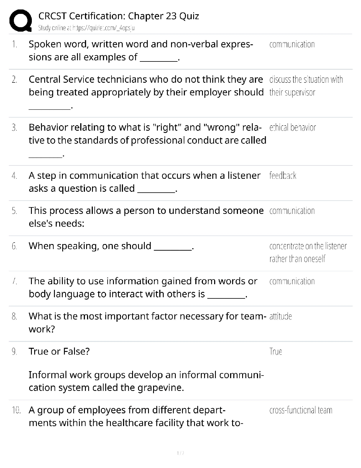 Prepare to excel on your CRCST certification exam with our detailed Test Bank for Chapter 23, focusing on Communication, Teamwork, and Professional Conduct. This essential study guide, derived from the core curriculum of HSPA's 'The Central Service Technical Manual, 9th Edition,' provides a complete set of quiz questions and verified answers. Solidify your understanding of critical topics such as ethical behavior, effective communication strategies, and teamwork dynamics within a healthcare facility. This resource is expertly designed to help you master the material, build confidence, and pass your CRCST exam with flying colors on your first attempt.