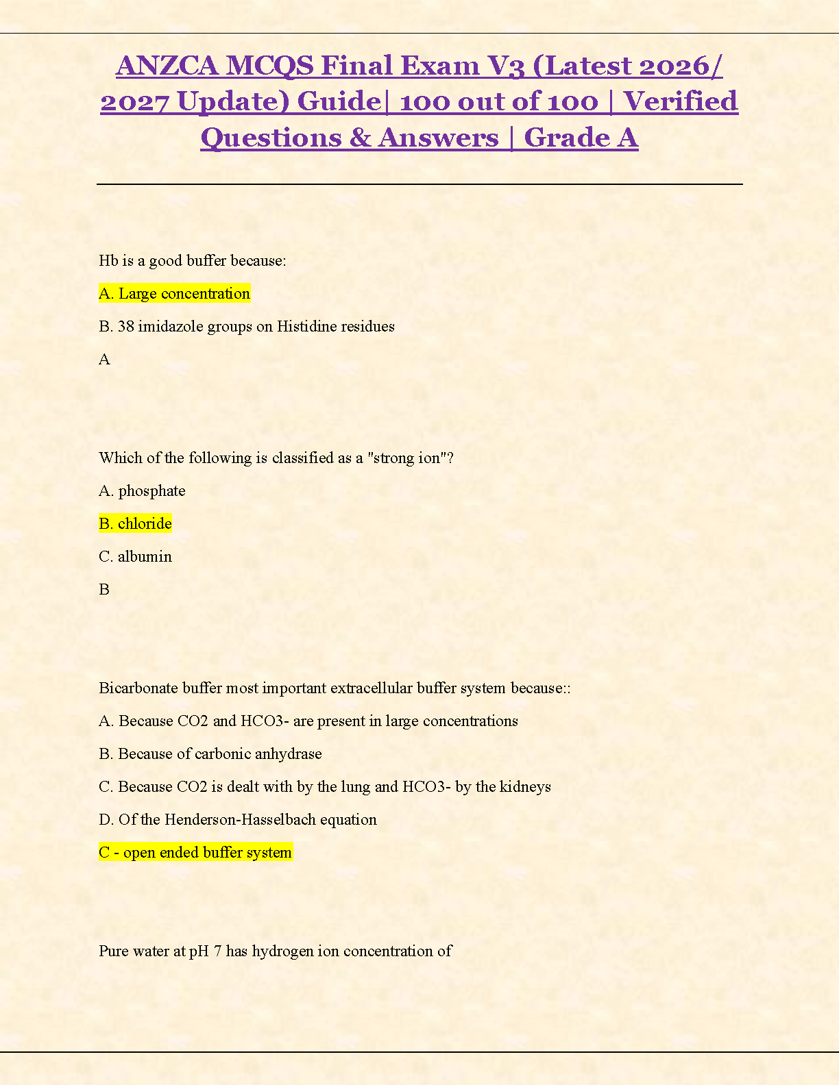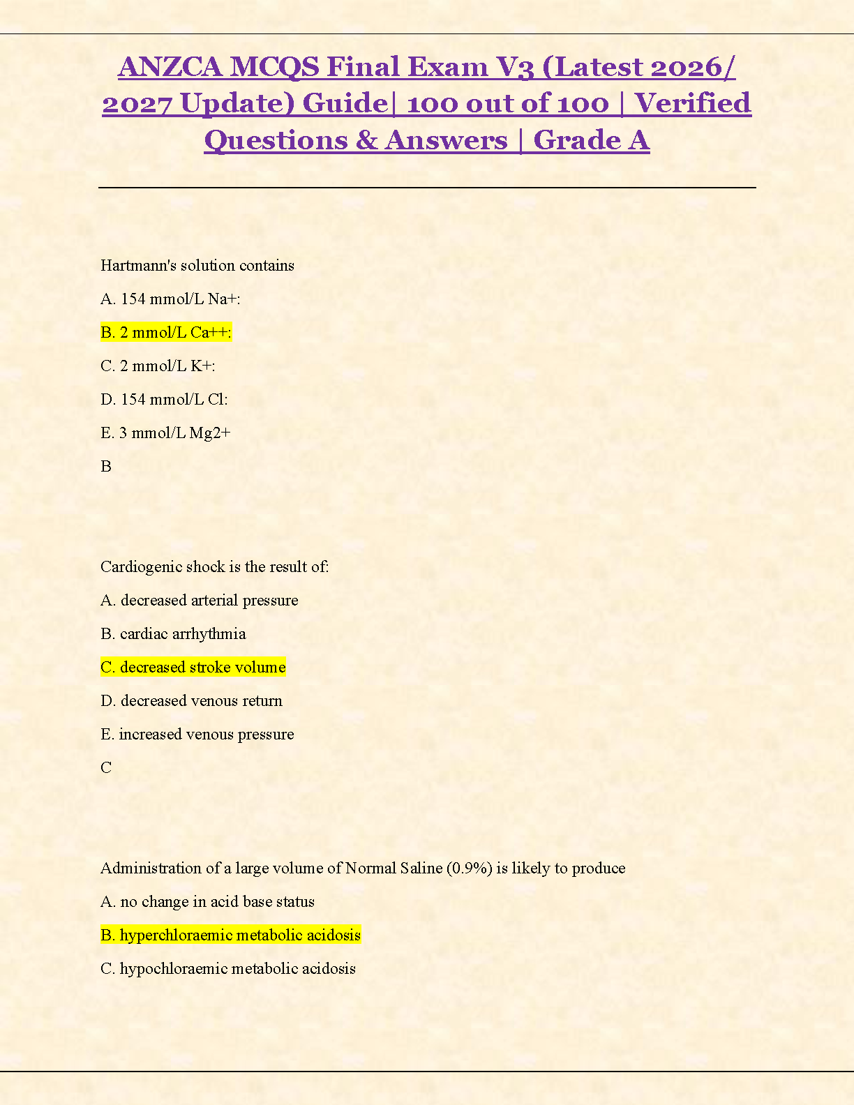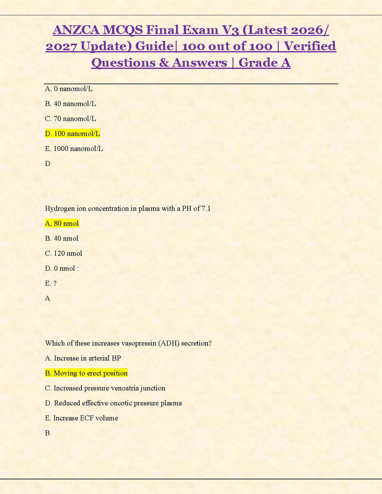 Excel in your Australian and New Zealand College of Anaesthetists (ANZCA) final exam with this comprehensive V3 Test Bank. Featuring the latest 2026/2027 updated Multiple Choice Questions (MCQs) with 100% verified answers, this guide is designed to ensure your success. Master crucial concepts, enhance your preparation, and pass with confidence on your first attempt. This is the ultimate resource for any candidate aiming for a top grade.
