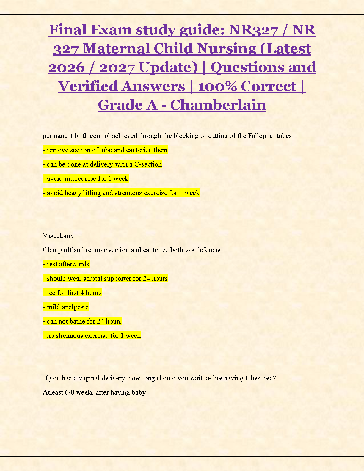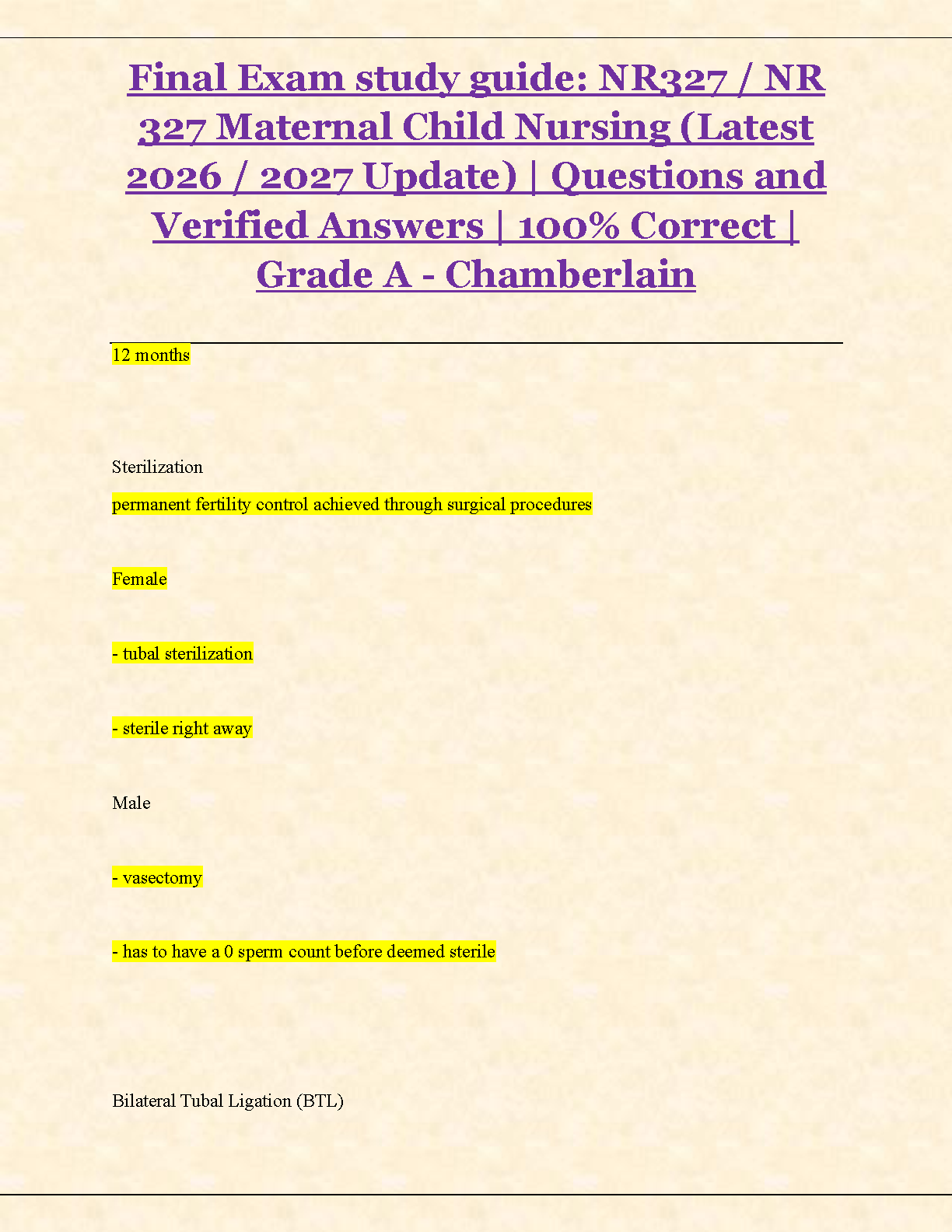 Prepare to ace your NR 327 Maternal Child Nursing final exam at Chamberlain University with our latest 2026-2027 study guide. This comprehensive resource is filled with meticulously curated questions and 100% correct, verified answers, directly aligned with the curriculum and the key textbook by Susan Scott Ricci, Theresa Kyle, and Susan Carman. Master essential topics such as contraception counseling, perimenopausal care, and other critical concepts. This guide is your ultimate tool to build confidence, eliminate exam anxiety, and secure a top grade on your first attempt, helping you avoid resits. Get ready to excel!