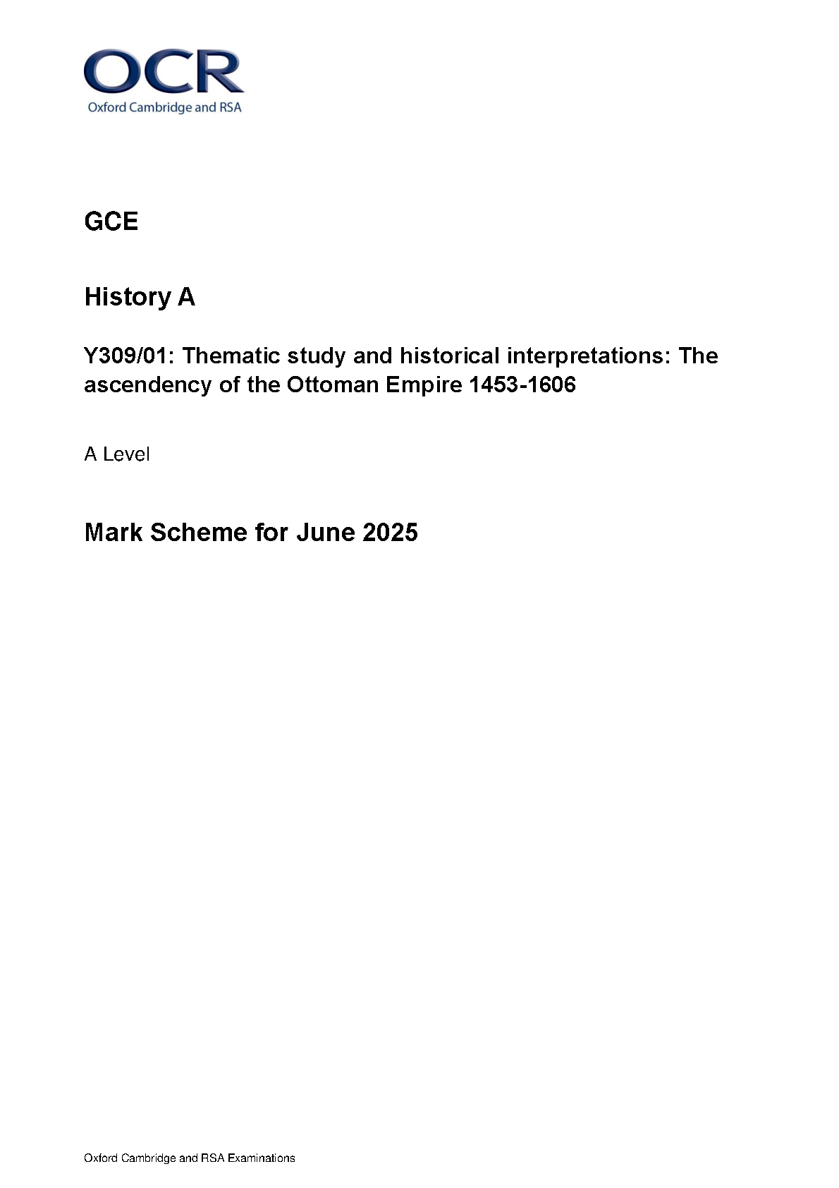 2025 OCR A Level History A Mark Scheme Paper 1 (Y309/01: Thematic study and historical interpretations: The ascendency of the Ottoman Empire 1453-1606)
