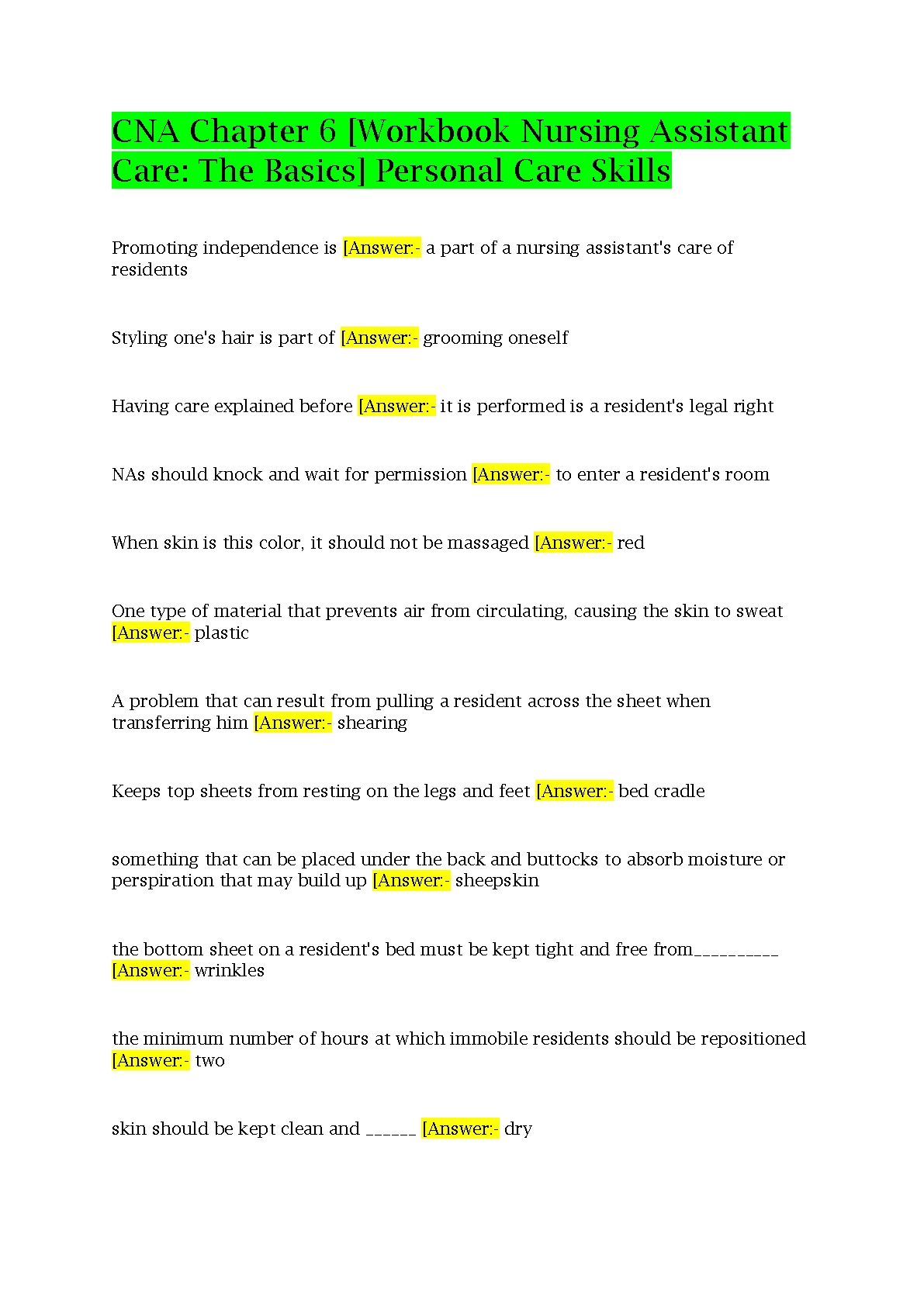 CNA Chapter 6 [Workbook Nursing Assistant Care: The Basics] Personal Care Skills. UPDATED 2023. DOWNLOAD on www.hackedexams.com INSTANTLY.