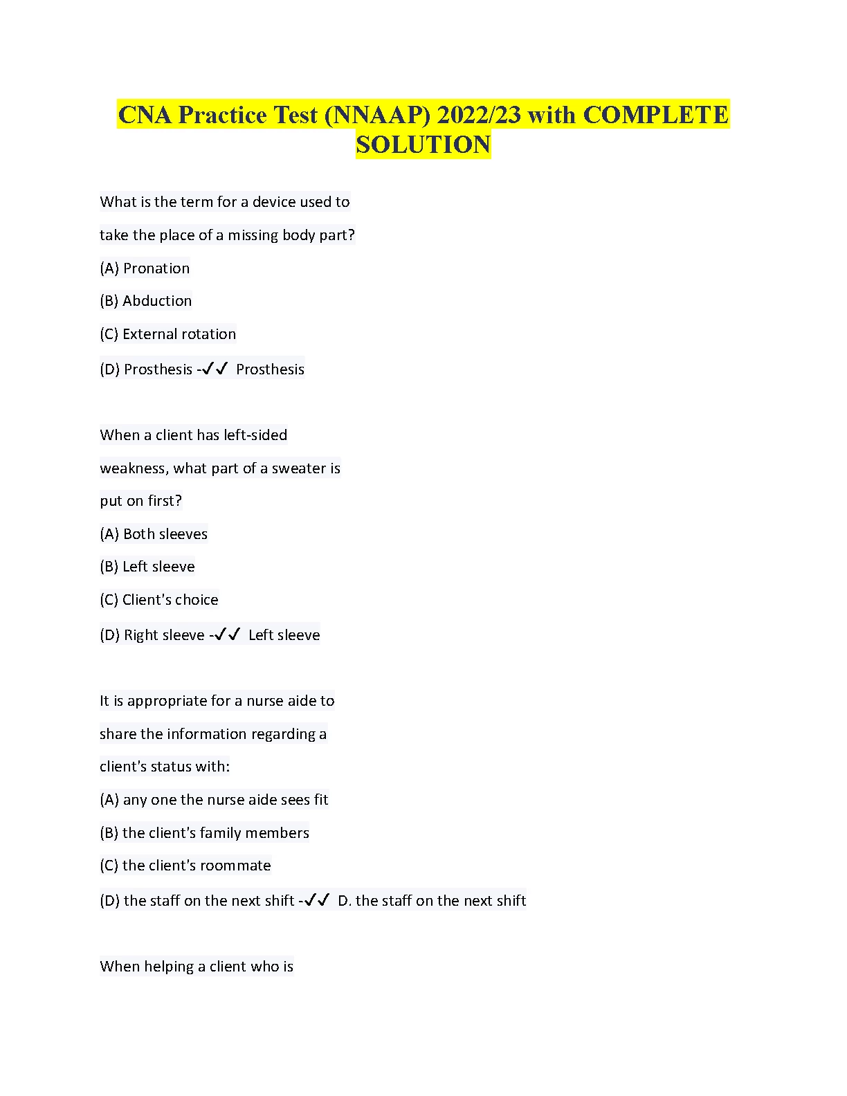 CNA Practice Test (NNAAP) WITH COMPLETE SOLUTION 2022/2023. DOWNLOAD on www.hackedexams.com INSTANTLY.