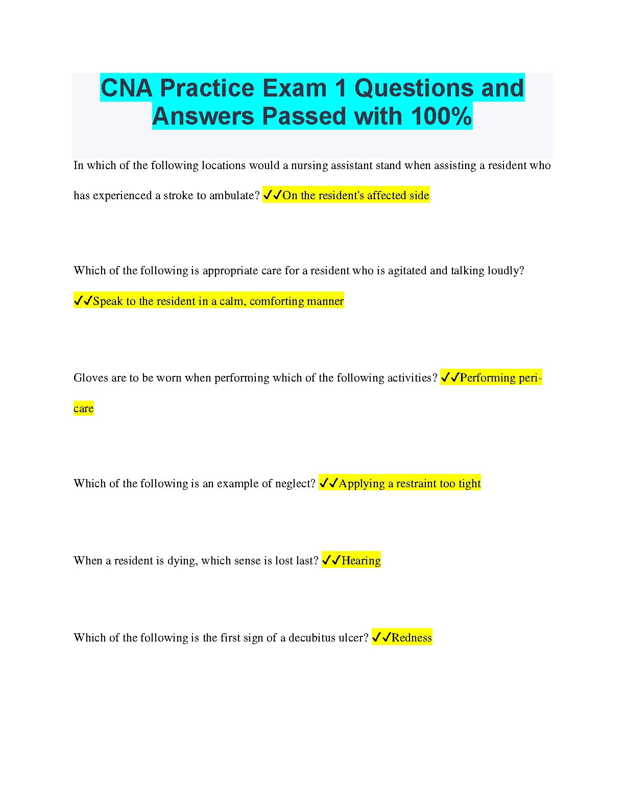 CNA Practice Exam 1 Questions and Answers 2023/2024. GUARANTEED PASS