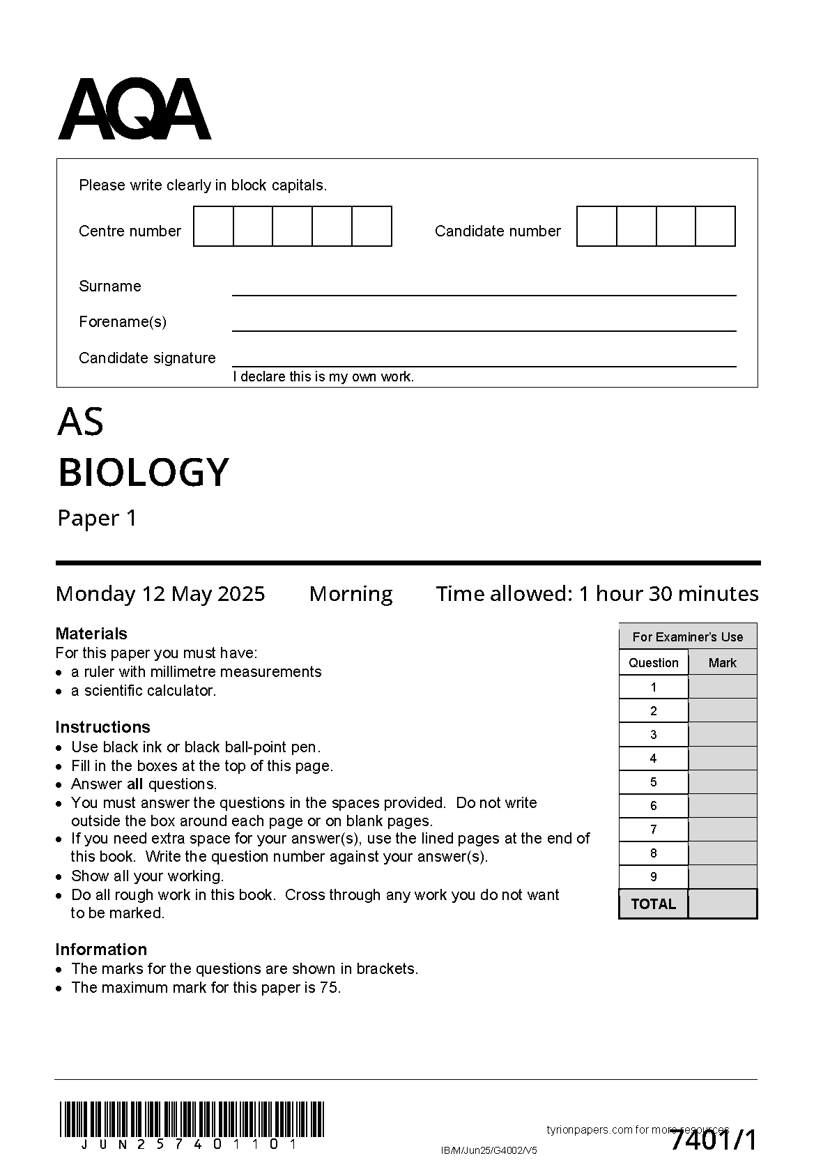 2025 AQA AS Level Biology Mark scheme Paper 1 (7401/1)
