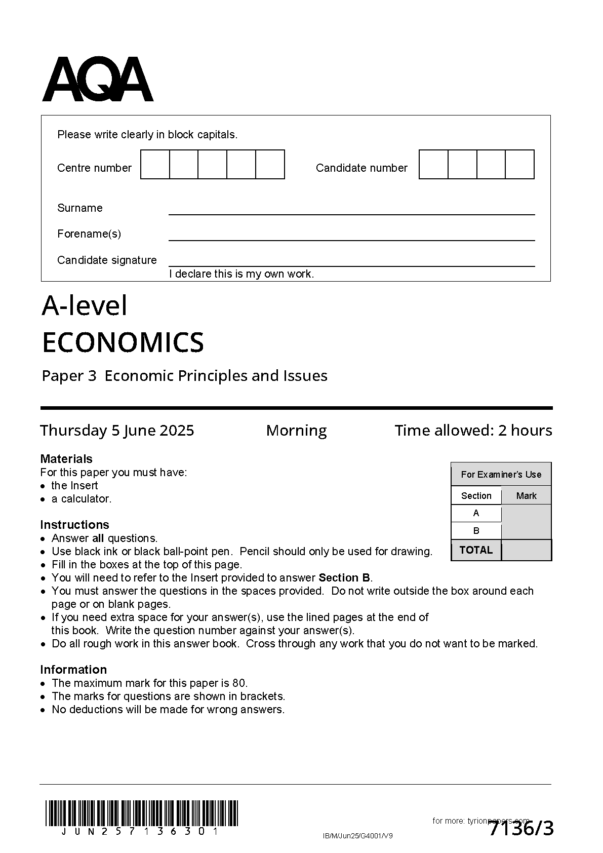 2025 AQA A Level Economics Paper 3 (7136/3: Economic Principles and Issues)