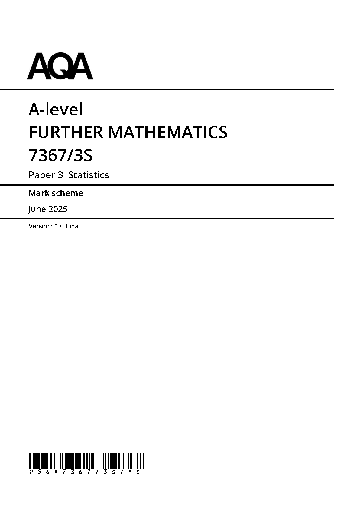 2025 AQA A Level Further Mathematics Mark Scheme Paper 3 (7367/3S: Statistics)