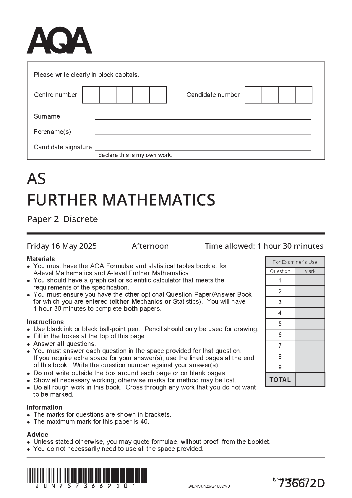 2025 AQA AS Level Further Mathematics Paper 2 (7366/2D: Discrete)