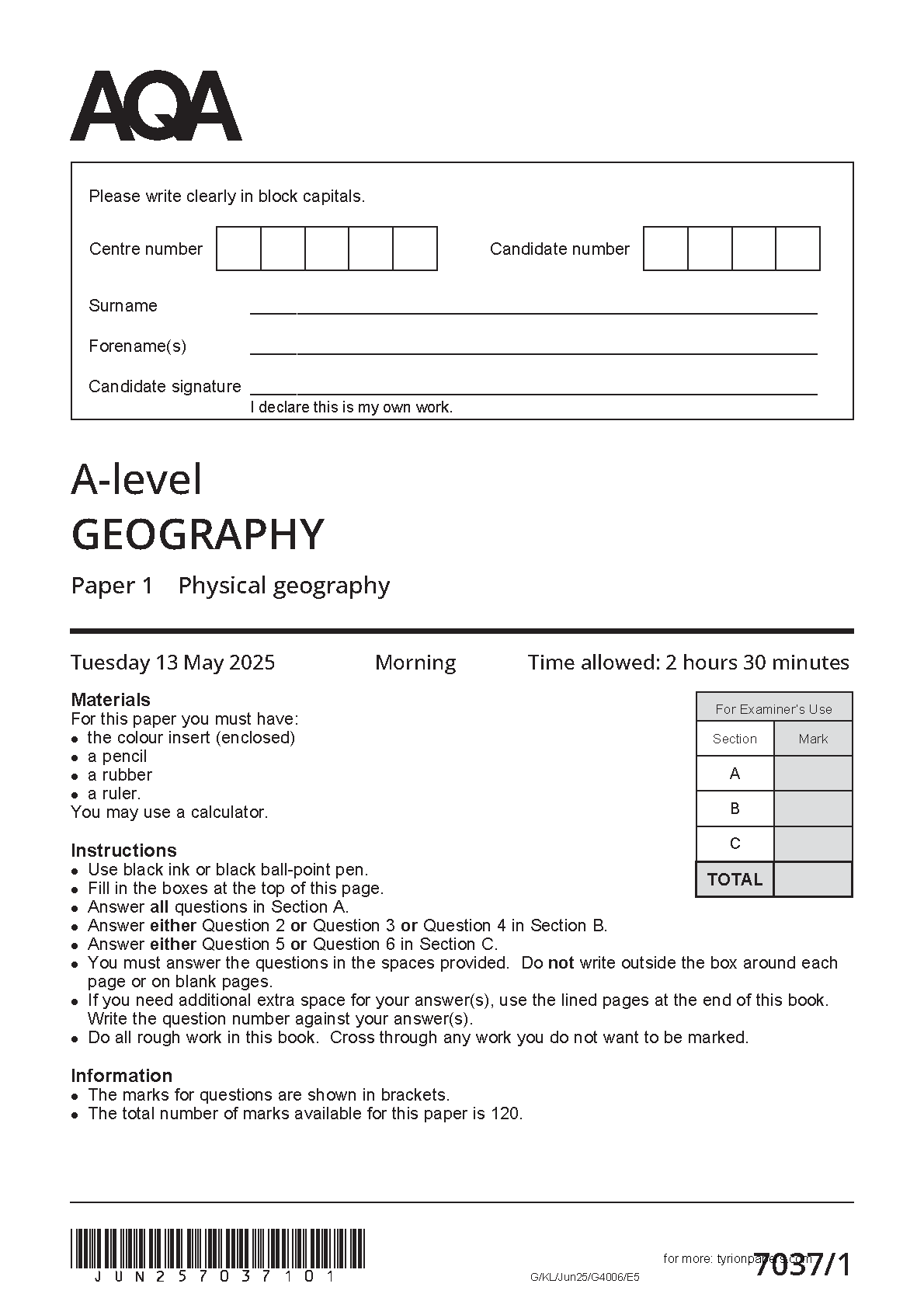 2025 AQA AS Level Geography Paper 1(7037/1: Physical geography)