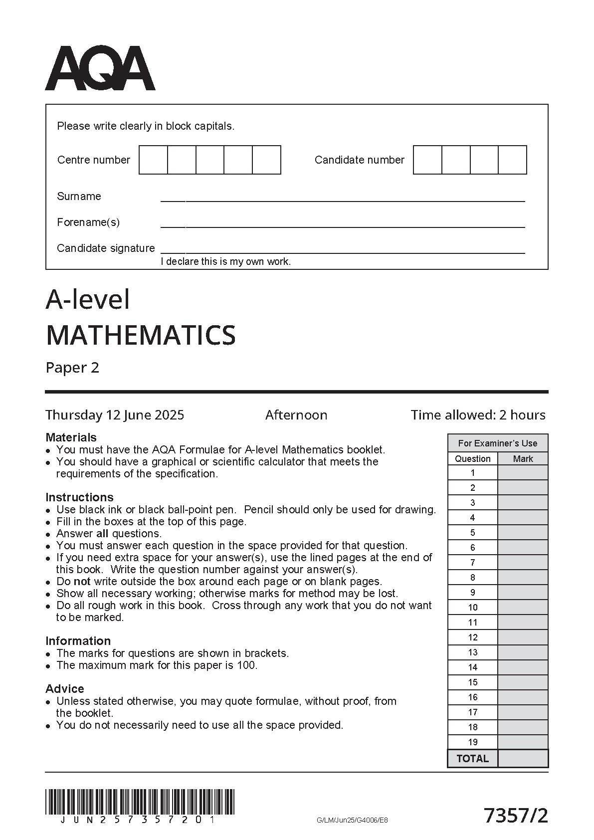2025 AQA A Level Mathematics Paper 2 (7357/2)