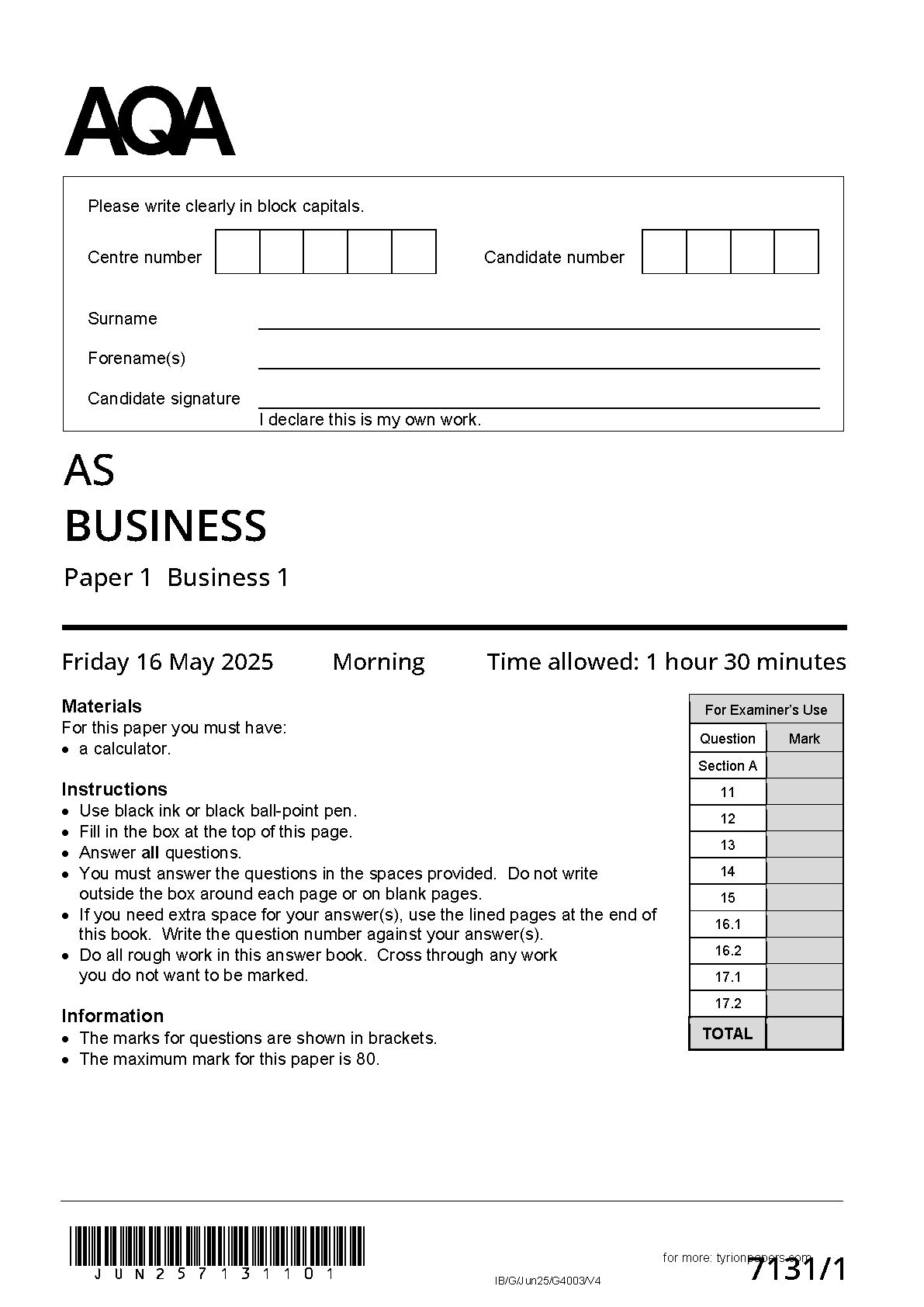 2025 AQA AS Level Business Paper 1 (7131/1: Business 1)