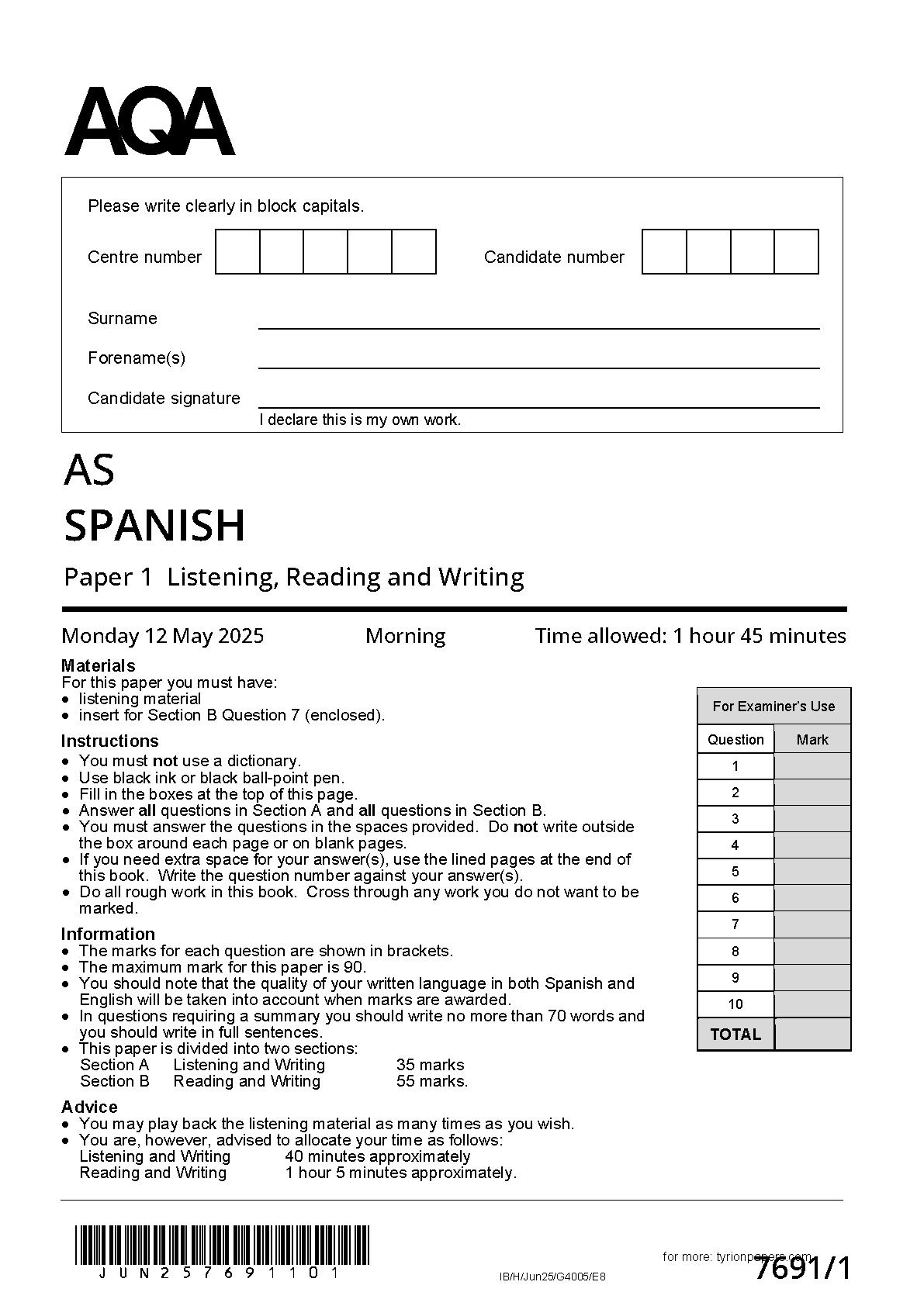 2025 AQA AS Level Spanish Paper 1 (7691/1: Listening, Reading and Writing)