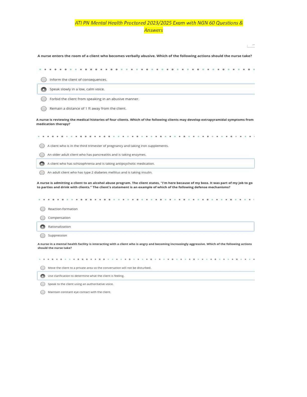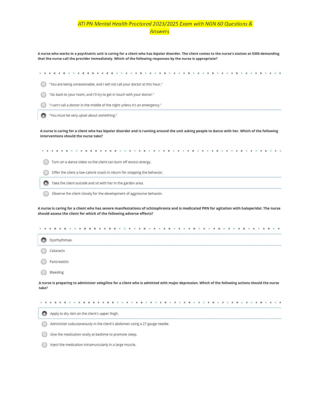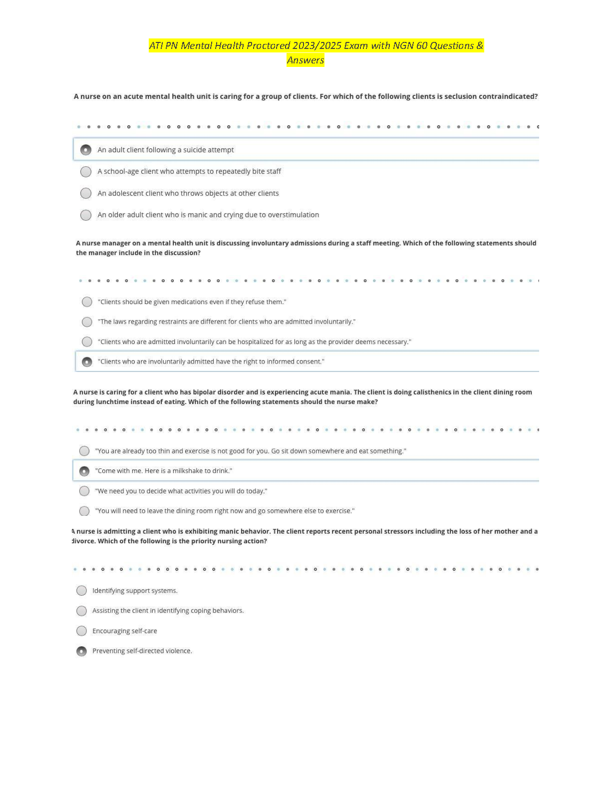 Unlock success on your ATI PN Mental Health Proctored Exam with our latest 2025/2026 study guide. This comprehensive resource is expertly crafted to help you pass on your very first attempt, eliminating the stress of resits. Inside, you'll find 60 meticulously selected questions, complete with verified answers and rationales, all updated to reflect the latest Next Generation NCLEX (NGN) format. Master critical mental health nursing concepts, from therapeutic communication to psychopharmacology, and build the confidence you need to excel. This is the ultimate tool for practical nursing students dedicated to acing their proctored exams.