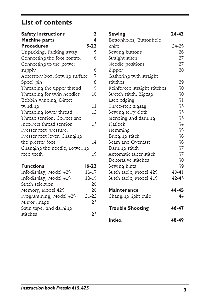 Unlock the full potential of your Husqvarna Viking sewing machine with this comprehensive user's guide for the Freesia 415 and 425 models. This official manual provides detailed, step-by-step instructions on everything from basic setup and threading to advanced stitches and machine maintenance. Download the complete PDF guide to master all features and ensure your Freesia runs smoothly for years to come. Perfect for both beginners and experienced sewists.