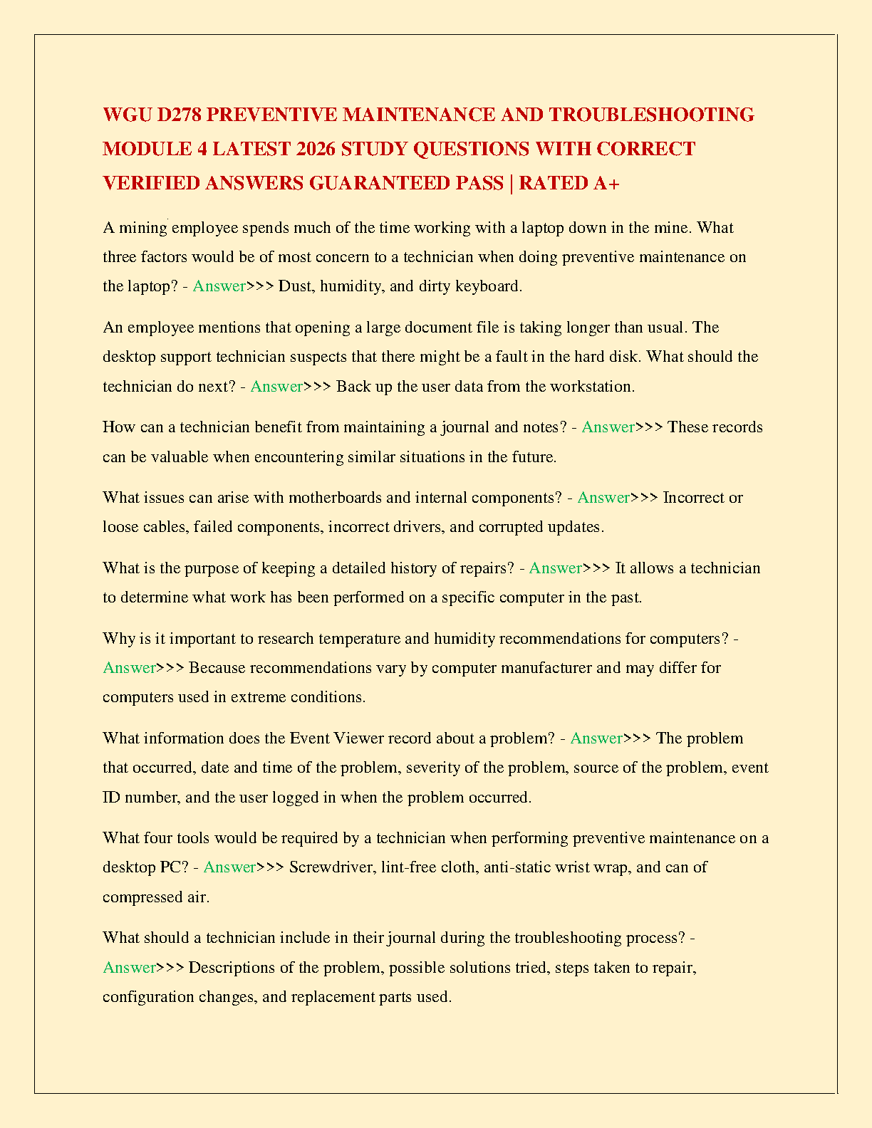 Unlock success in your WGU D278 course with this comprehensive study guide for Module 4, specifically designed for the 2025/2026 academic year. This resource features a complete set of verified questions and detailed answers covering all key concepts in Preventive Maintenance and Troubleshooting. Master topics like hardware maintenance in extreme conditions, diagnosing hard drive issues, and proper documentation to ensure you pass your exams on the first attempt. This A+ rated guide is your ultimate tool to avoid resits and excel in your studies.