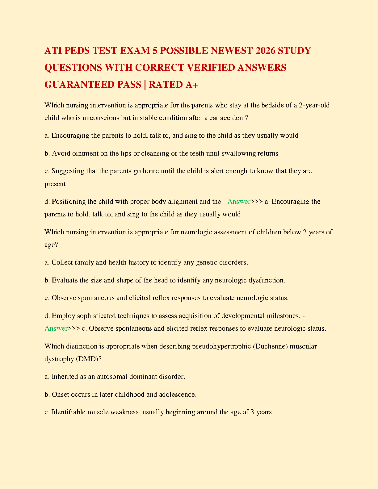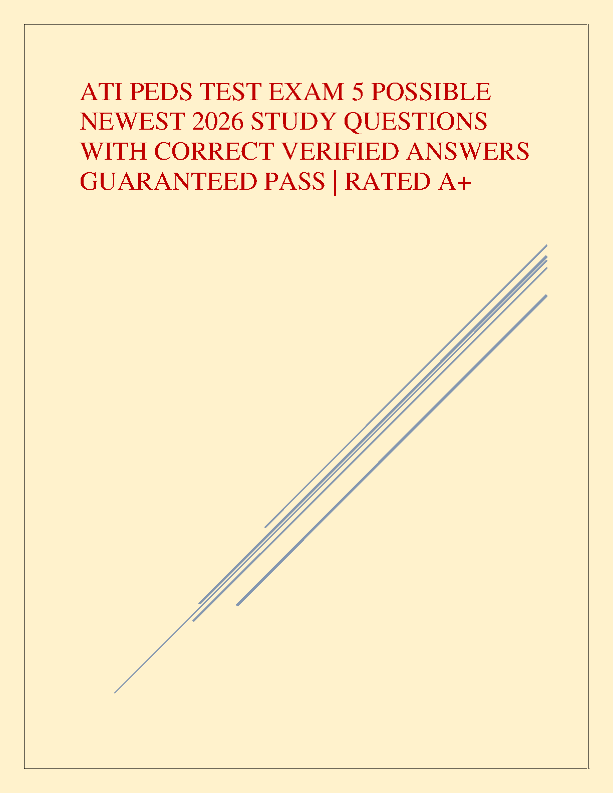 Ace your pediatric nursing exam with our latest resource for 2026! This comprehensive study guide for the ATI Peds Test Exam 5 provides a complete set of possible study questions, each with a correct, verified answer. Designed to help you achieve an A+ grade, this guide is your key to passing on the first attempt and avoiding costly resits. Get the confidence you need to excel in your pediatrics assessment with this guaranteed success package.