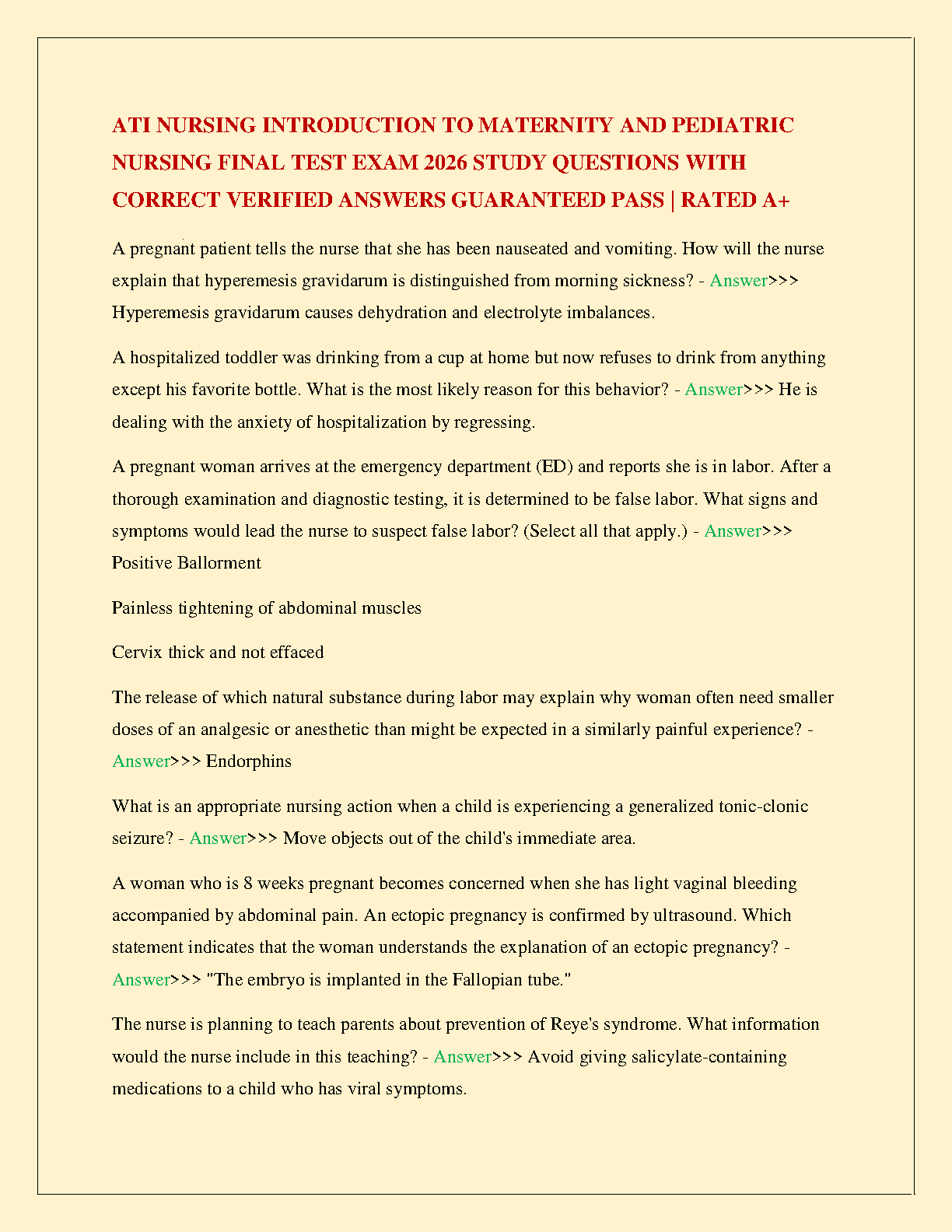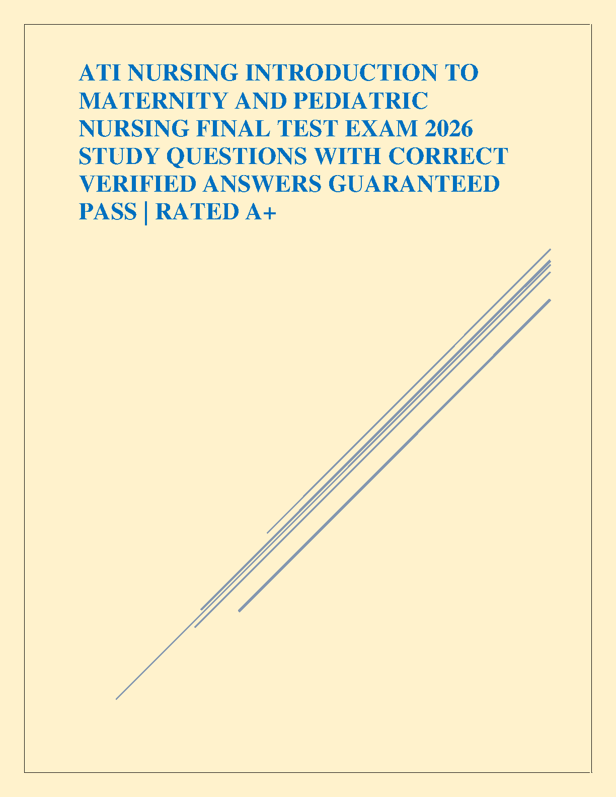 Master your ATI Introduction to Maternity and Pediatric Nursing course with our latest 2026 final exam test bank. This comprehensive study resource is meticulously compiled with a full range of study questions and 100% correct, verified answers. Designed to help you ace your exam on the first attempt, this guide covers all essential topics, ensuring you are fully prepared. Say goodbye to exam stress and the fear of resits. Achieve an A+ grade and build a strong foundation in maternity and pediatric nursing with this guaranteed-to-pass study solution.
