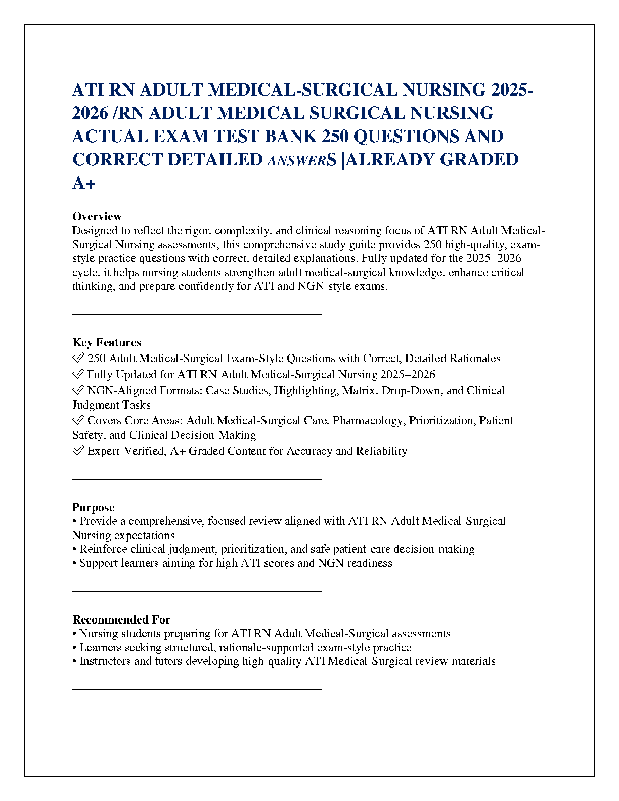 Master your ATI RN Adult Medical-Surgical Nursing exam with our comprehensive Test Bank for the 2025-2026 academic year. This A+ graded resource is packed with 250 high-quality, NGN-aligned practice questions, each accompanied by correct, detailed rationales. Designed to enhance your clinical reasoning and critical thinking, this study guide covers essential topics including pharmacology, patient safety, and prioritization. Prepare confidently and ace your exams with expert-verified content that mirrors the actual ATI assessment.