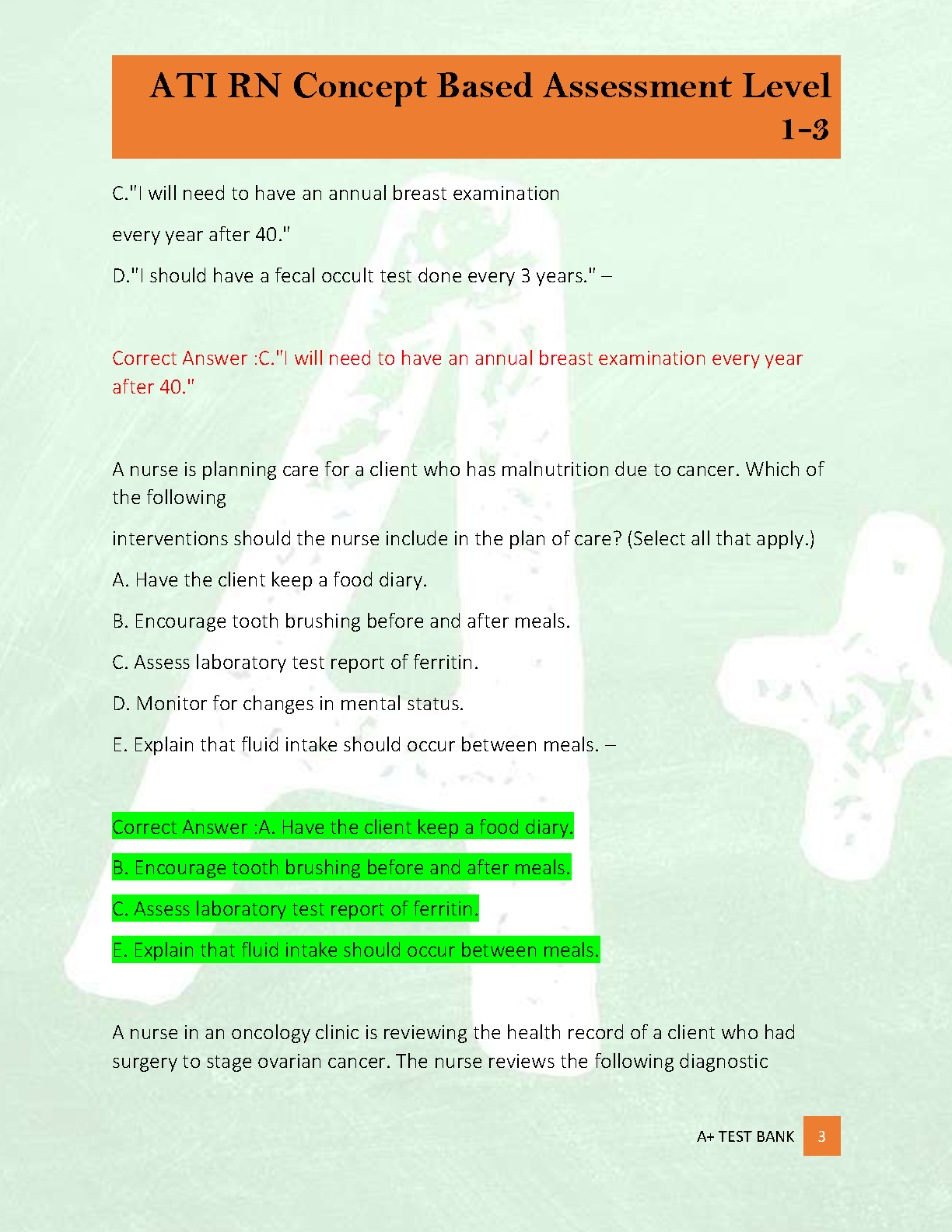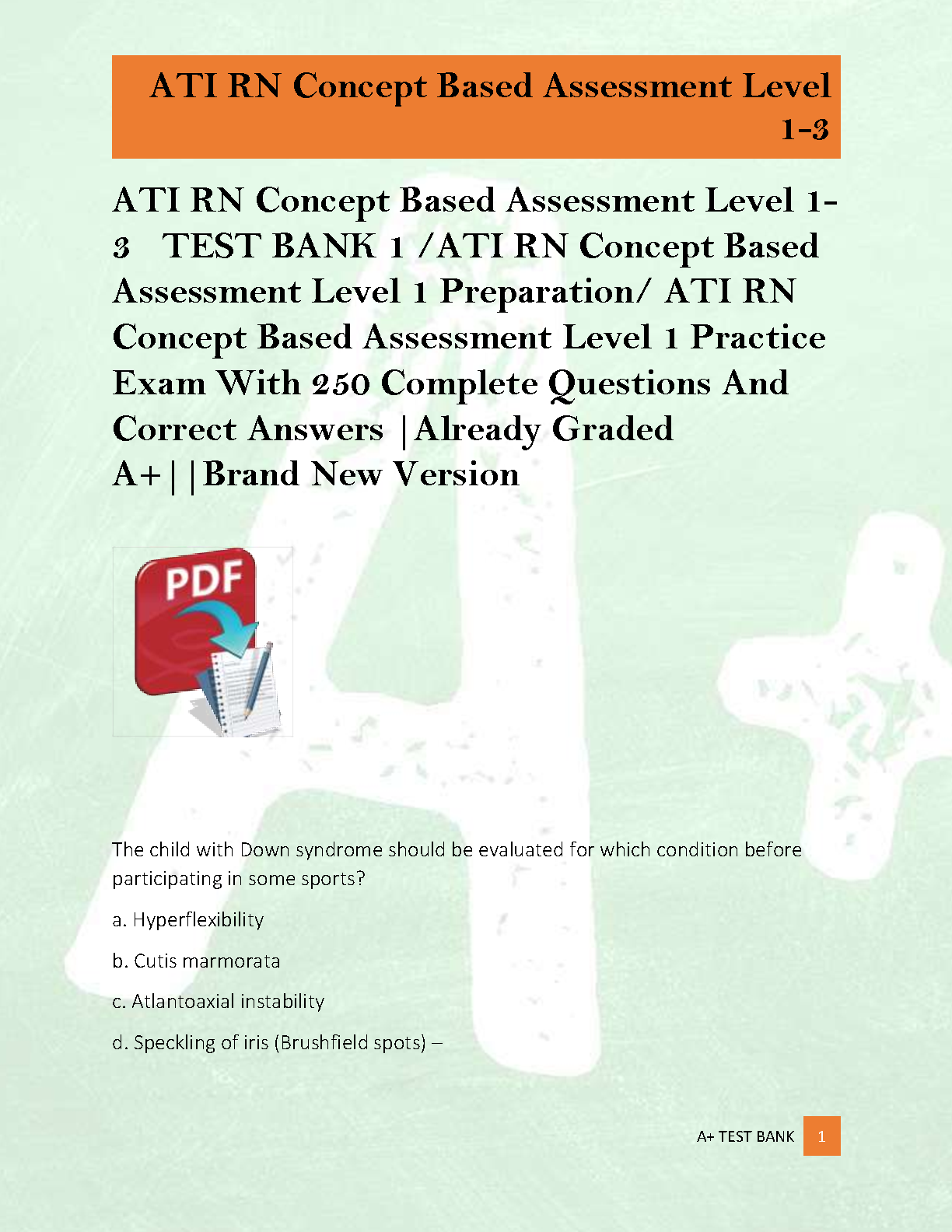 Get ready to excel in your nursing studies with our comprehensive Test Bank for the ATI RN Concept Based Assessment, covering Levels 1, 2, and 3. This brand new version includes 250 meticulously crafted questions, each with a correct, A+ graded answer. This essential study guide is designed to help you master key concepts, practice exam-style questions, and build the confidence needed to pass on your first attempt. Instantly download the PDF and start your journey to acing your ATI assessment!