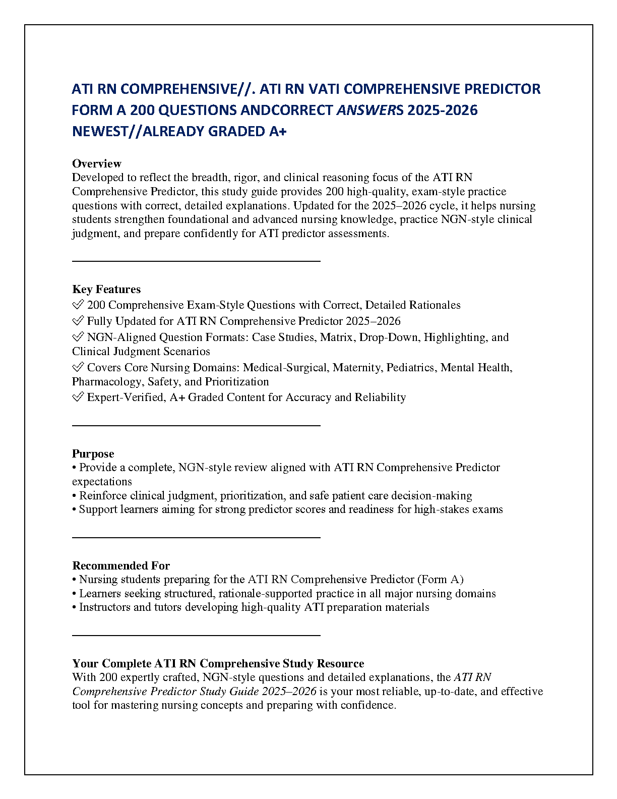 Ace your ATI RN Comprehensive Predictor exam with confidence! This brand-new, A+ graded study guide for the 2025-2026 academic year is your essential tool for achieving a top score and avoiding resits. Featuring 200 meticulously crafted, exam-style questions complete with correct answers and in-depth rationales, this resource is fully updated to reflect the latest NGN (Next Generation NCLEX) standards. Master complex clinical judgment scenarios across all core nursing domains, including Medical-Surgical, Maternity, Pediatrics, and Pharmacology. This guide is specifically designed to enhance your clinical reasoning and ensure you are fully prepared to pass on your first attempt.