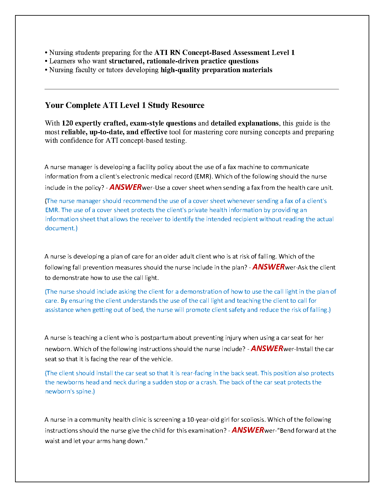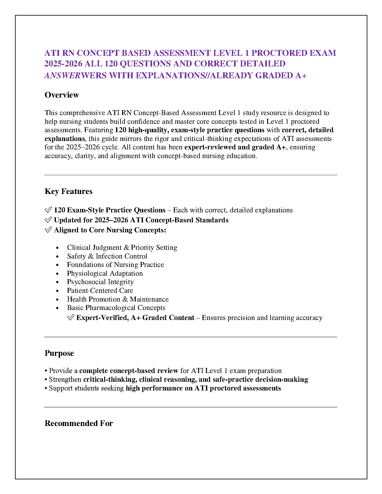 Ace your ATI RN Concept-Based Assessment Level 1 Proctored Exam on the first try with our ultimate 2025-2026 study guide. This comprehensive resource is expertly crafted to help nursing students master core concepts and build unshakable confidence. Inside, you'll find 120 high-quality, exam-style practice questions, each paired with correct, in-depth explanations and rationales. All content is updated for the latest 2025-2026 ATI standards and has been expert-reviewed to guarantee A+ graded accuracy. Prepare effectively, enhance your critical-thinking and clinical reasoning skills, and walk into your proctored exam ready to succeed.
