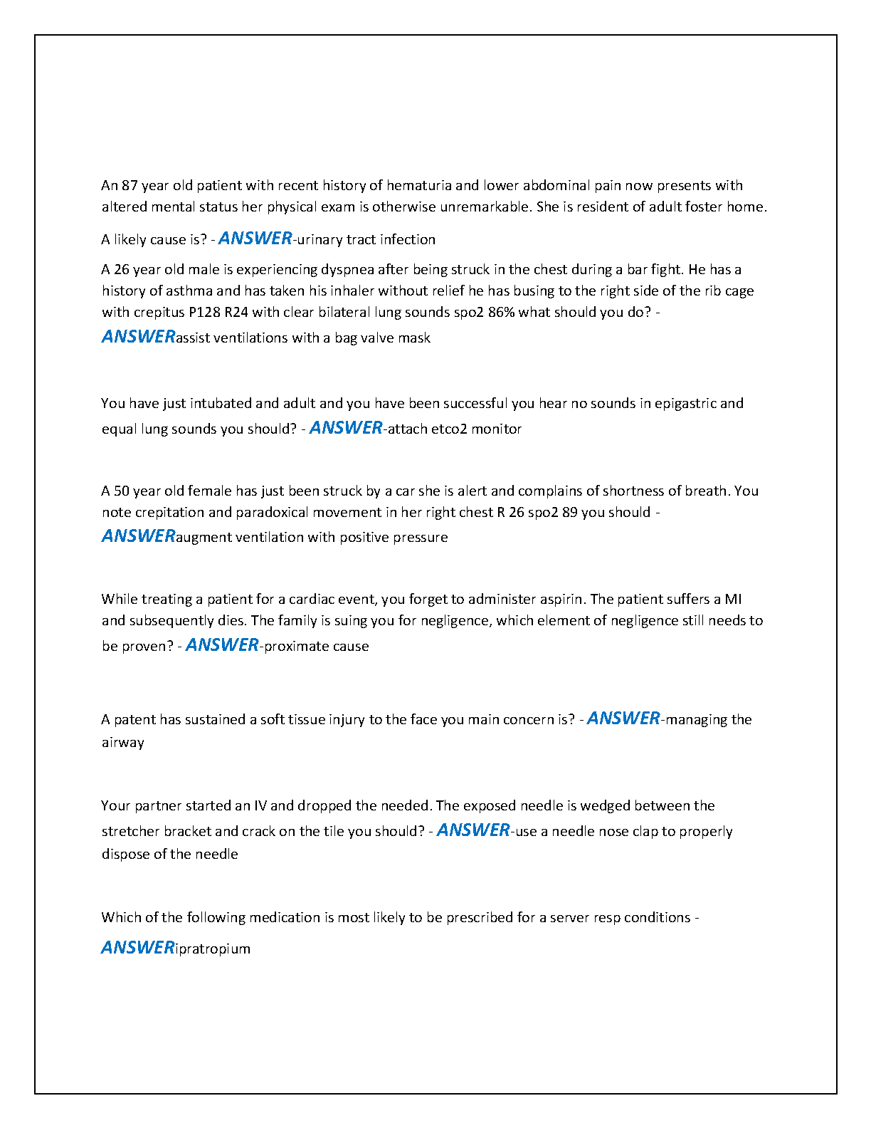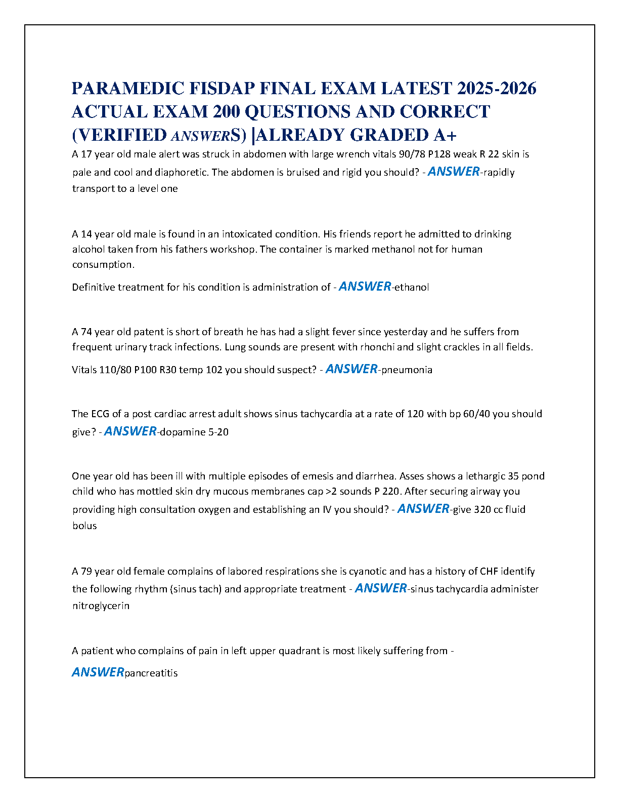 Prepare to excel on your Paramedic FISDAP Final Exam with our latest and most comprehensive study resource for 2025-2026. This A+ graded test bank is packed with 200 actual exam questions, each accompanied by a thoroughly verified and correct answer. Covering a wide range of critical topics from trauma and cardiology to pharmacology and patient care scenarios, this guide is designed to boost your confidence and ensure you pass on your first attempt. Master the material and avoid resits with this essential preparation tool.