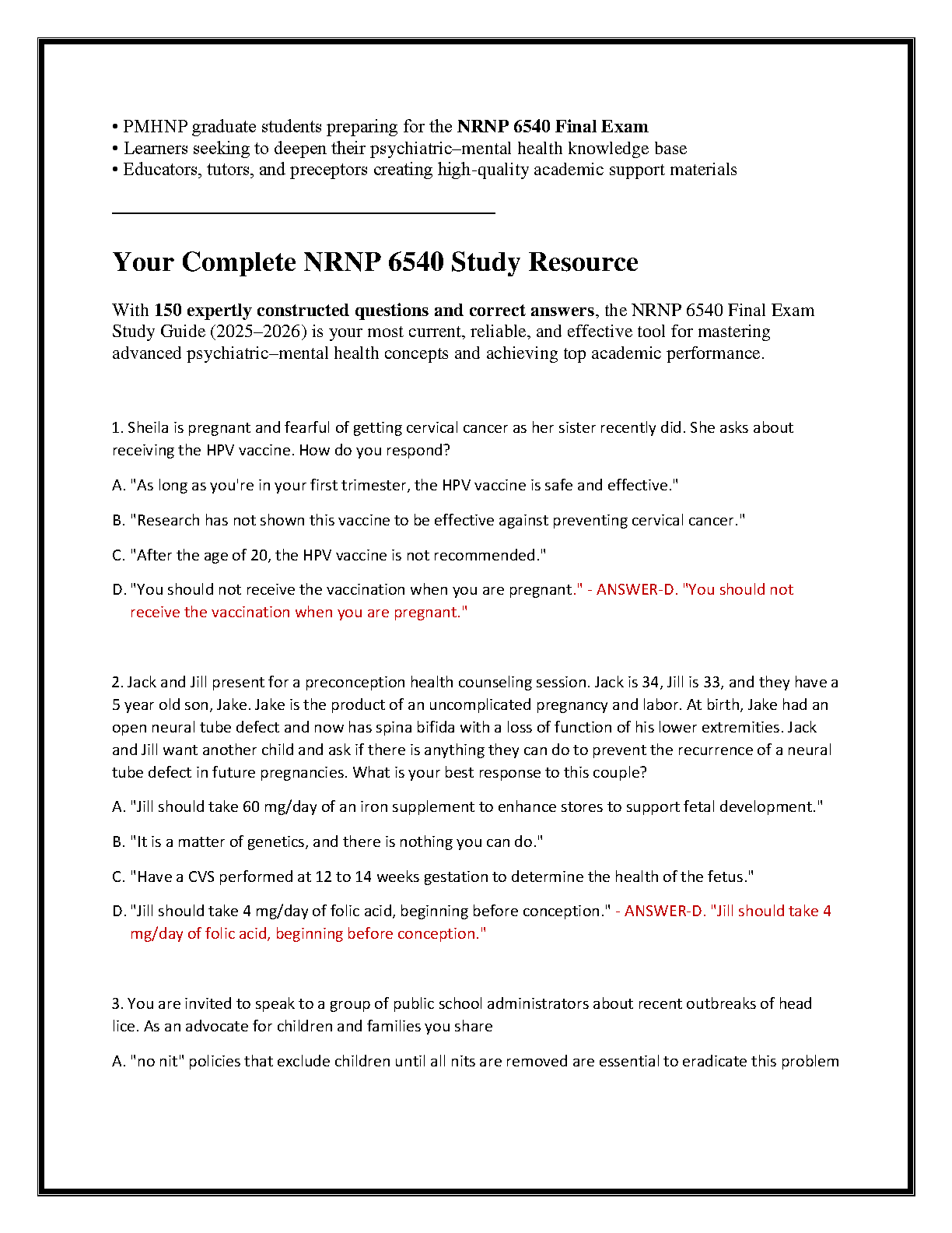 Prepare to excel in your NRNP 6540 Final Exam with our latest study guide, fully updated for the 2025-2026 PMHNP curriculum. This comprehensive resource is expertly designed to help you pass on your first attempt, featuring 150 meticulously crafted, A+ graded questions complete with detailed, correct answers. Dive deep into essential topics such as diagnostic assessment, psychopharmacology, neurodevelopment, mood disorders, and psychotherapy. This guide mirrors the real exam format, providing the perfect tool to strengthen your clinical reasoning, build confidence, and master the advanced psychiatric-mental health nursing competencies required for success.