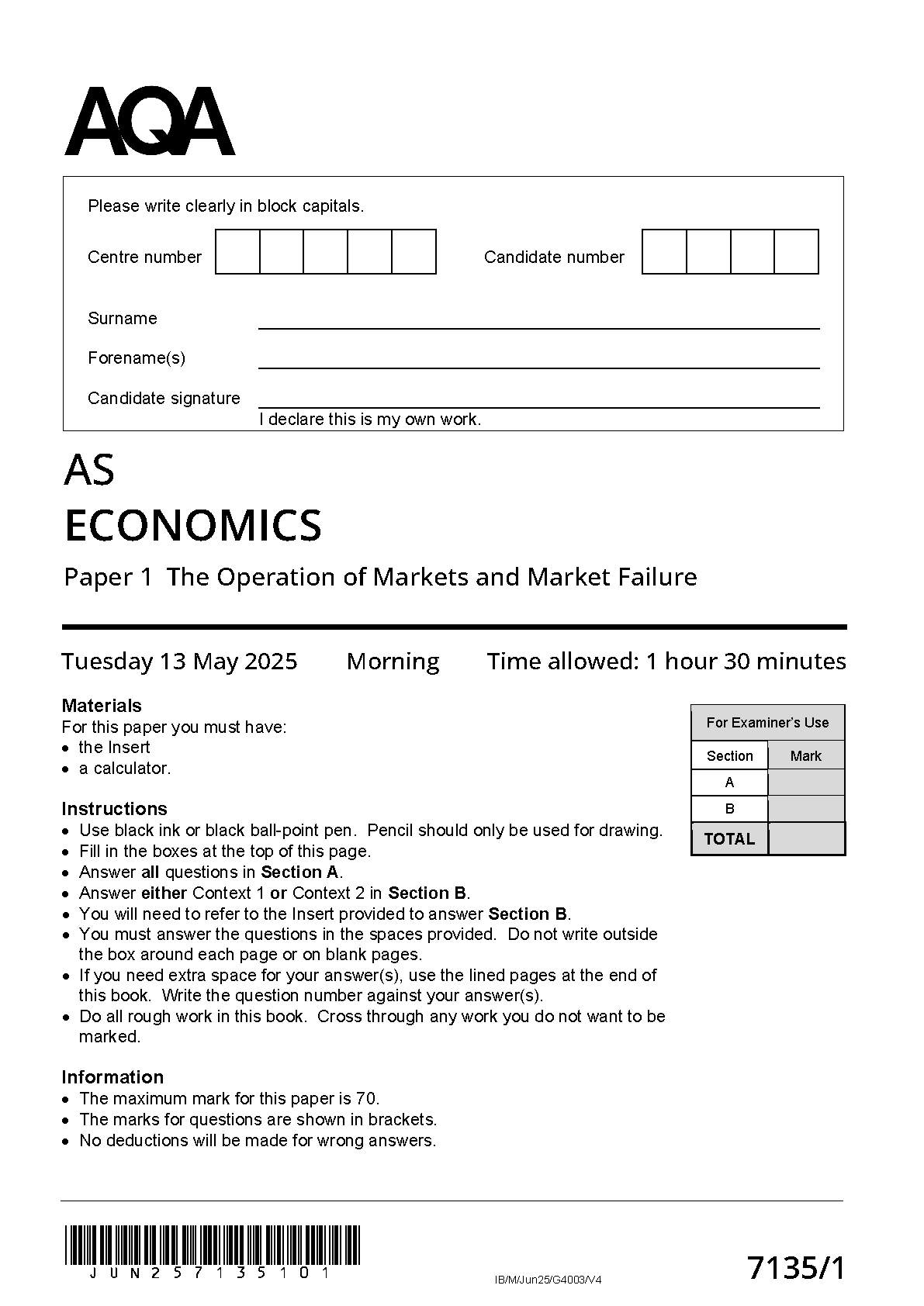 MERGED 2025 AQA AS ECONOMICS Paper 1 and Mark Scheme (7135/1: The Operation of Markets and Market Failure)
