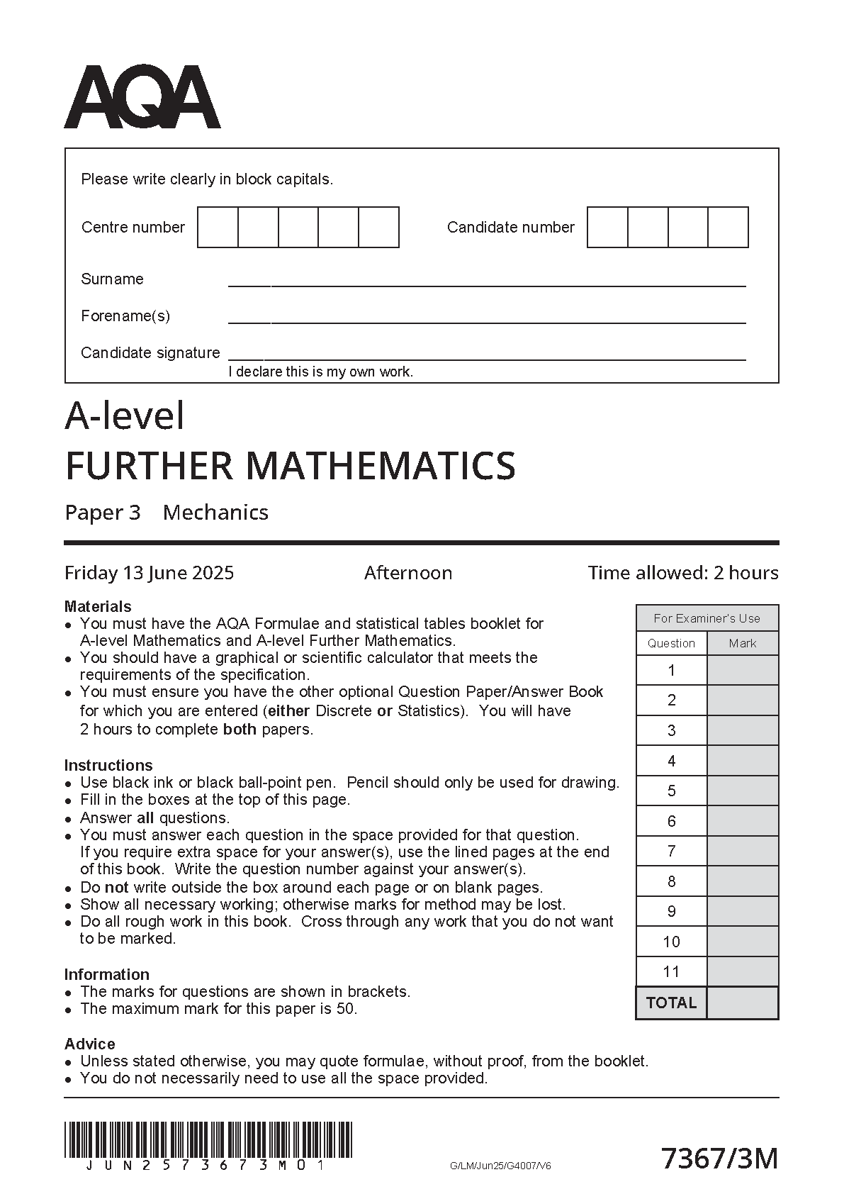 Bundle 2025 AQA A Level FURTHER MATHEMATICS Paper 3 and Mark Scheme (7367/3M: Mechanics)