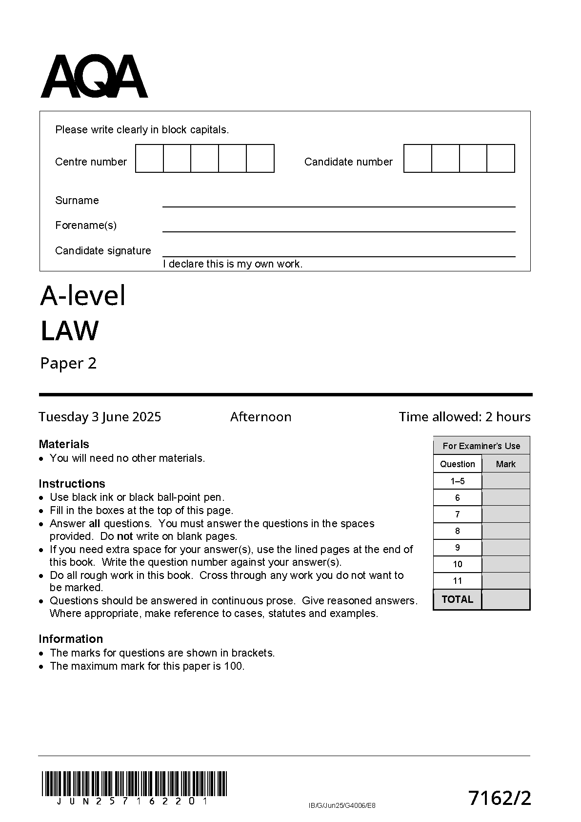 Bundle 2025 AQA A Level LAW Paper 2 Question Paper and Mark Scheme (7162/2)