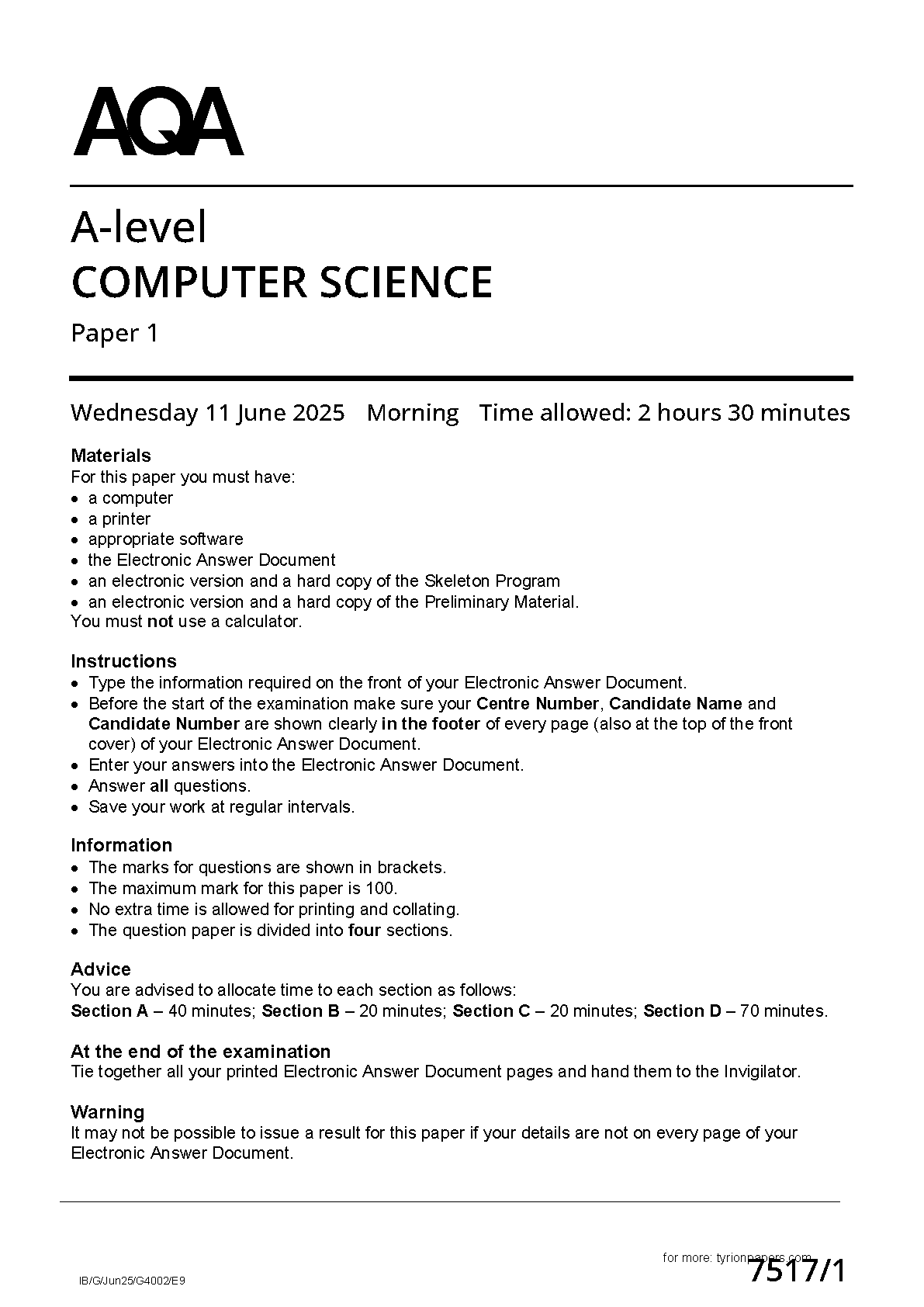 Combined 2025 AQA A Level COMPUTER SCIENCE Paper 1 and Mark Scheme (7517/1)