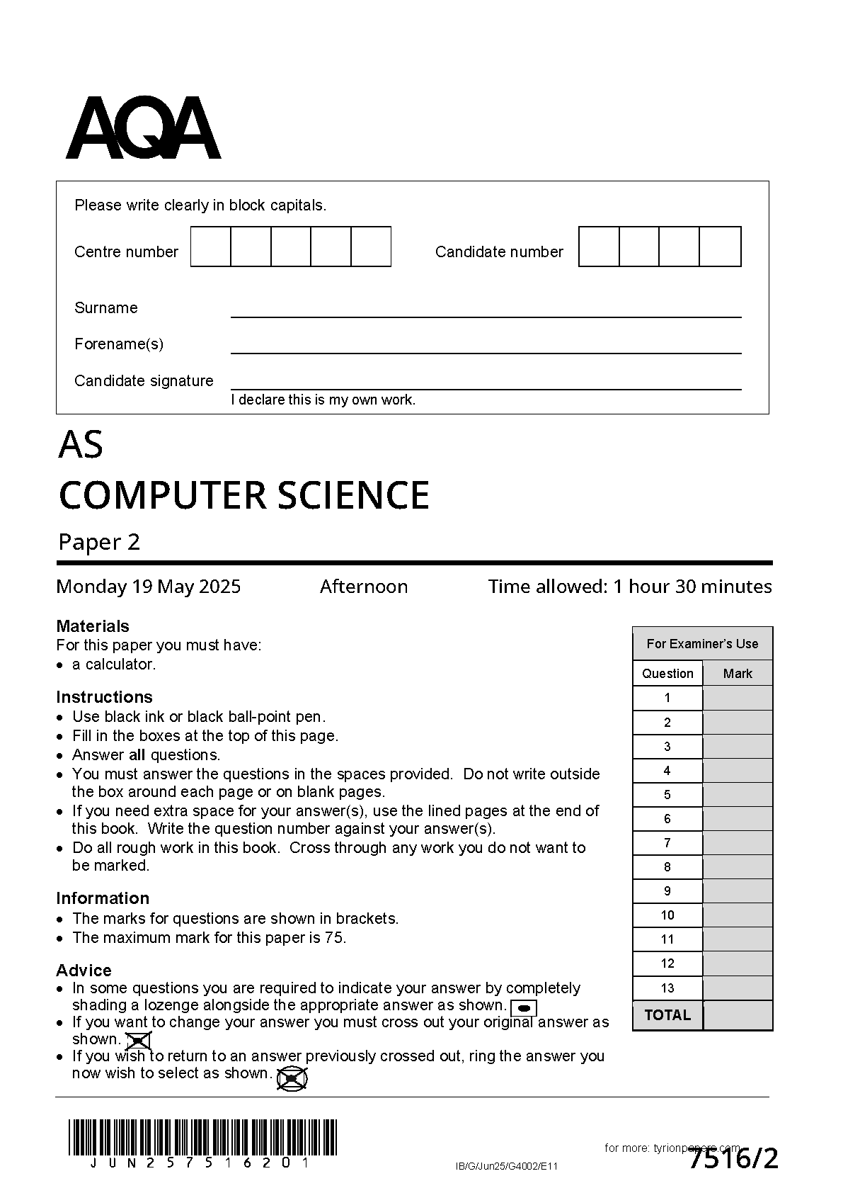Combined 2025 AQA AS COMPUTER SCIENCE Paper 2 Question Paper and Mark Scheme (7516/2)