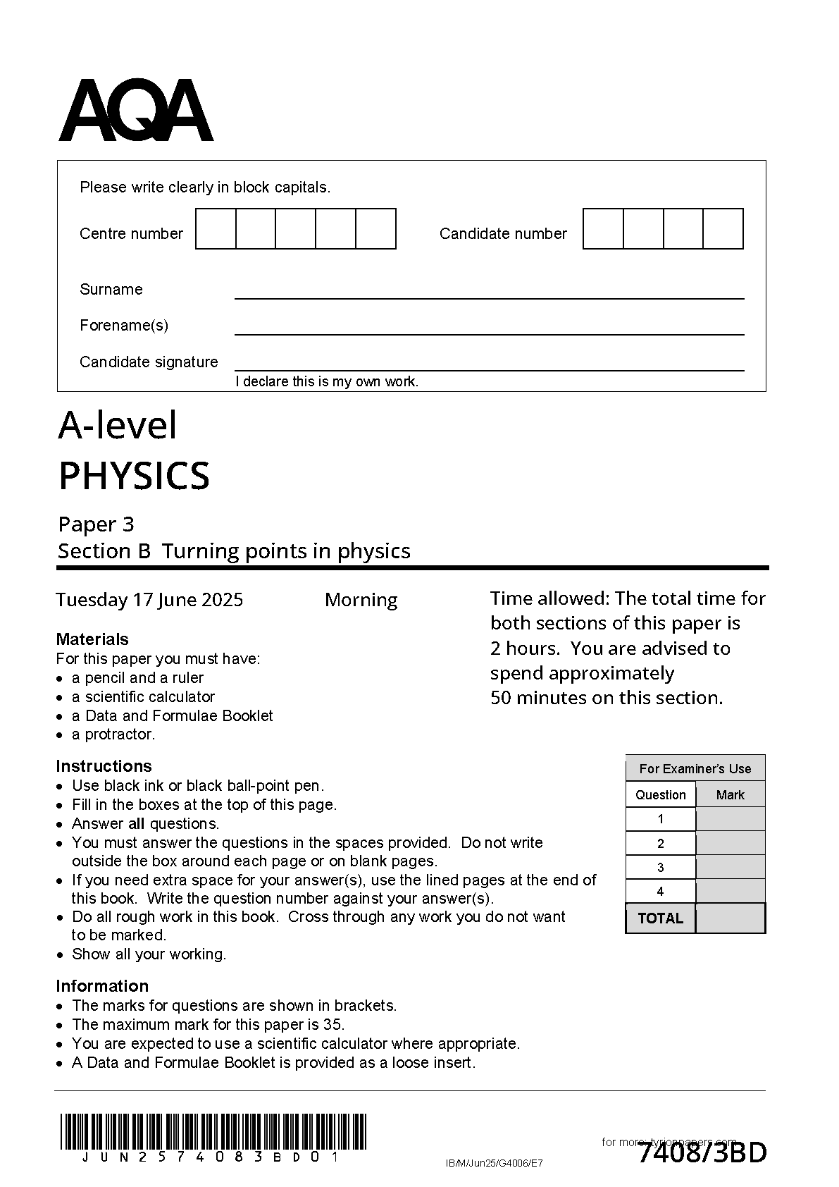 Combined 2025 AQA A Level PHYSICS Paper 3 and Mark Scheme (7408/3BD: Turning points in physics)