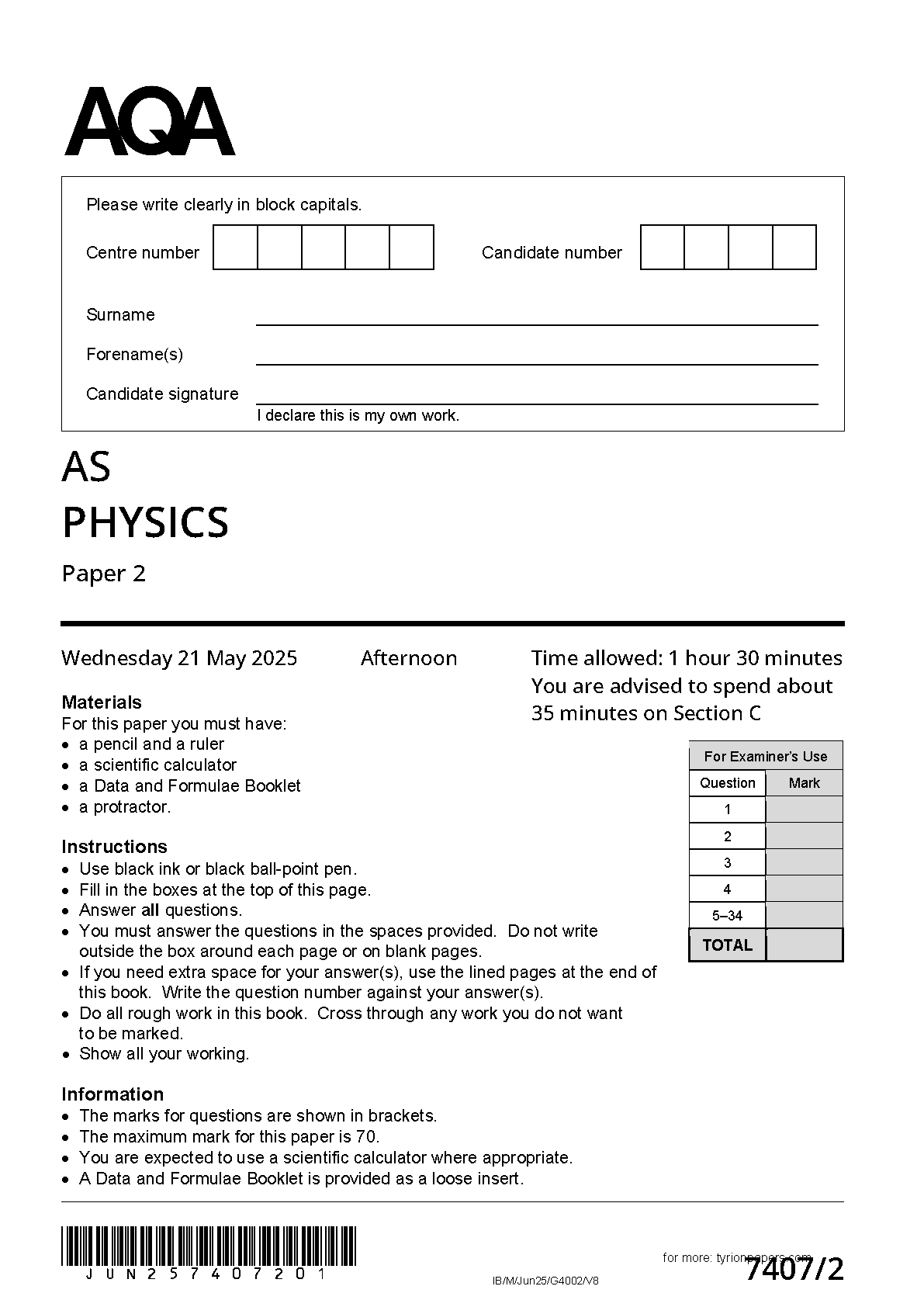 Combined 2025 AQA AS Level PHYSICS Paper 2 Question Paper and Mark Scheme (7407/2)
