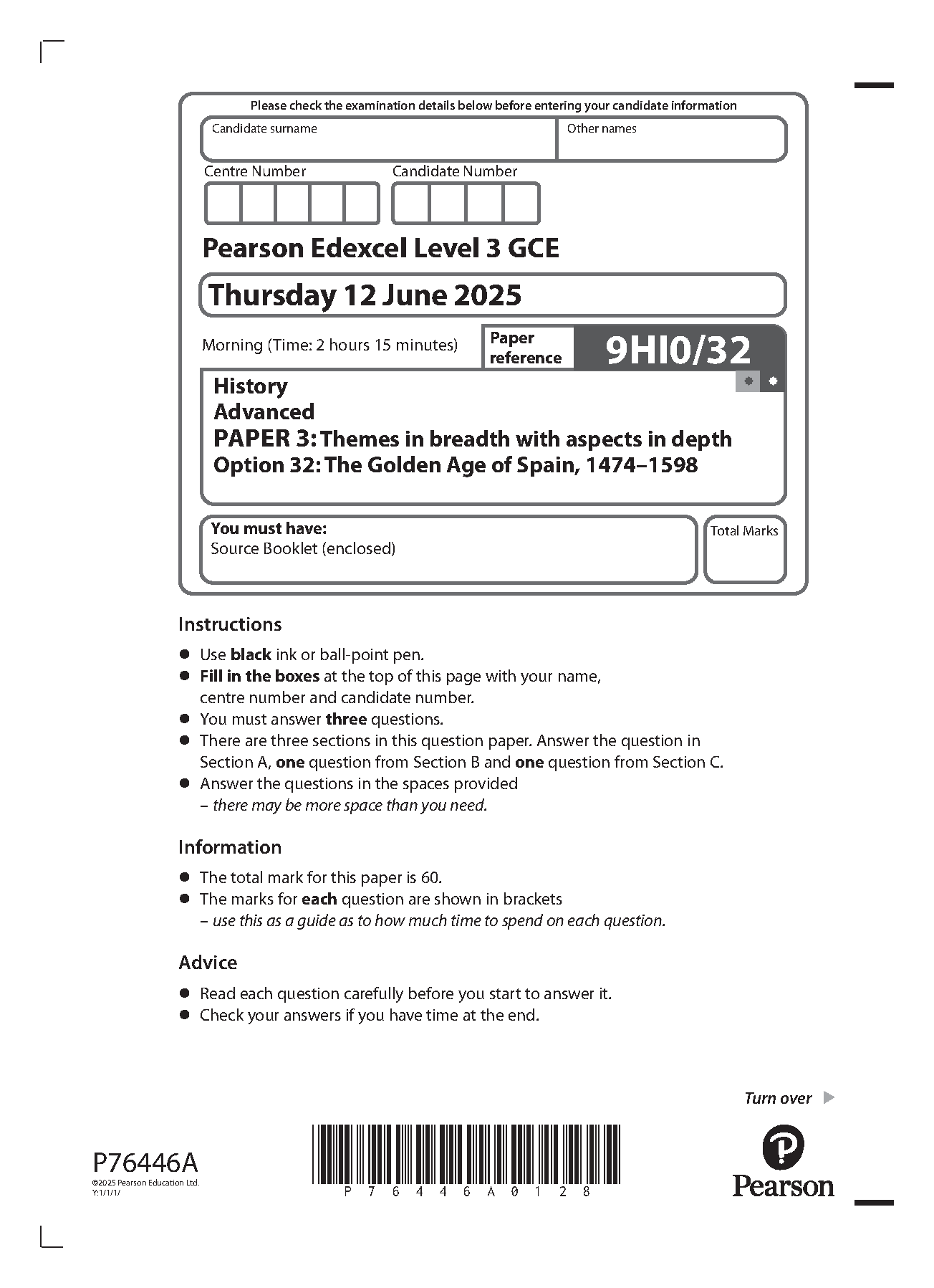 MERGED 2025 Pearson Edexcel A Level History PAPER 3 and Mark Scheme (9HI0/32: The Golden Age of Spain, 1474–1598)