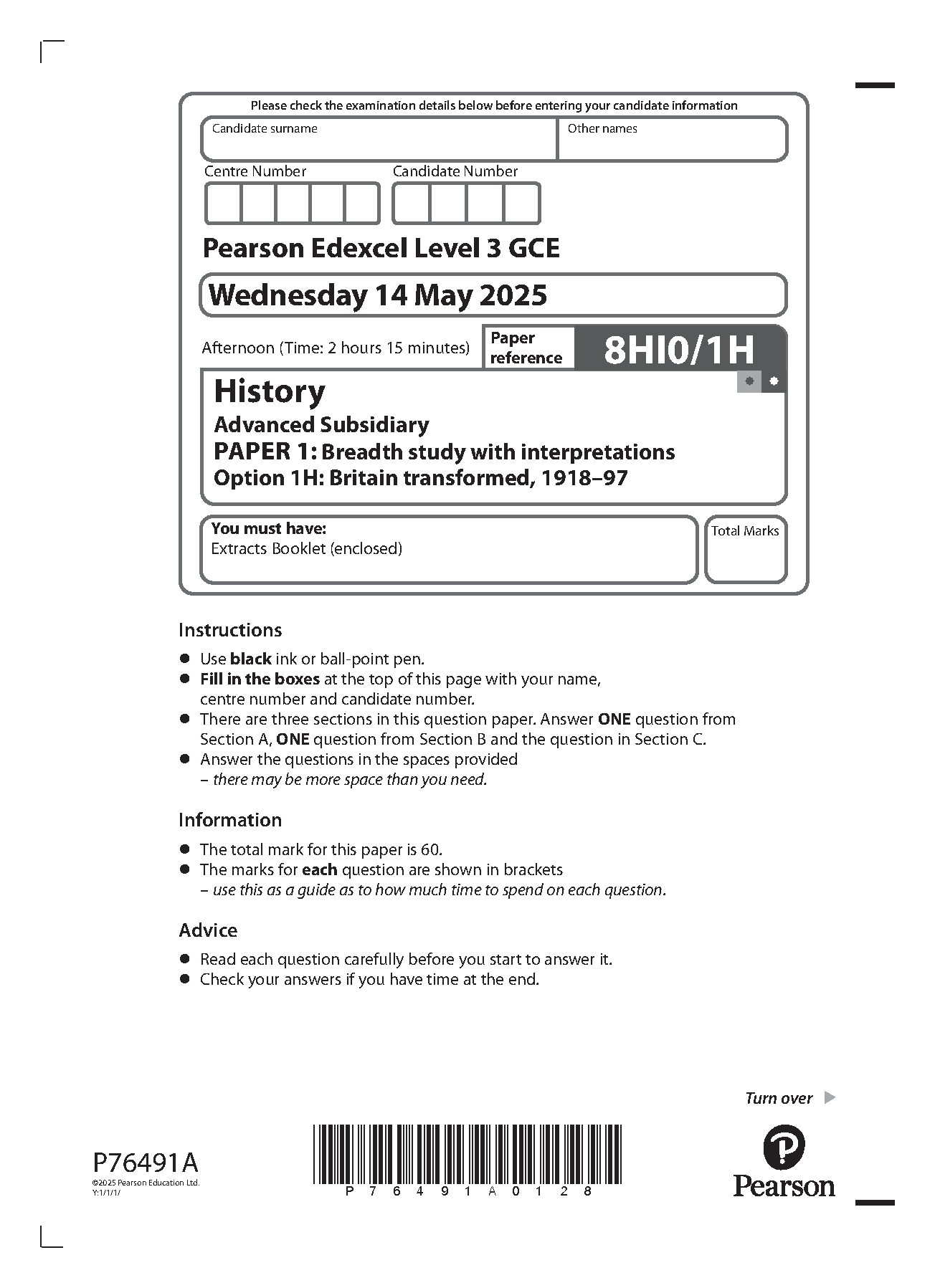 MERGED 2025 Pearson Edexcel AS Level History Paper 1 and Mark Scheme (8HI01H Britain transformed, 1918–97)