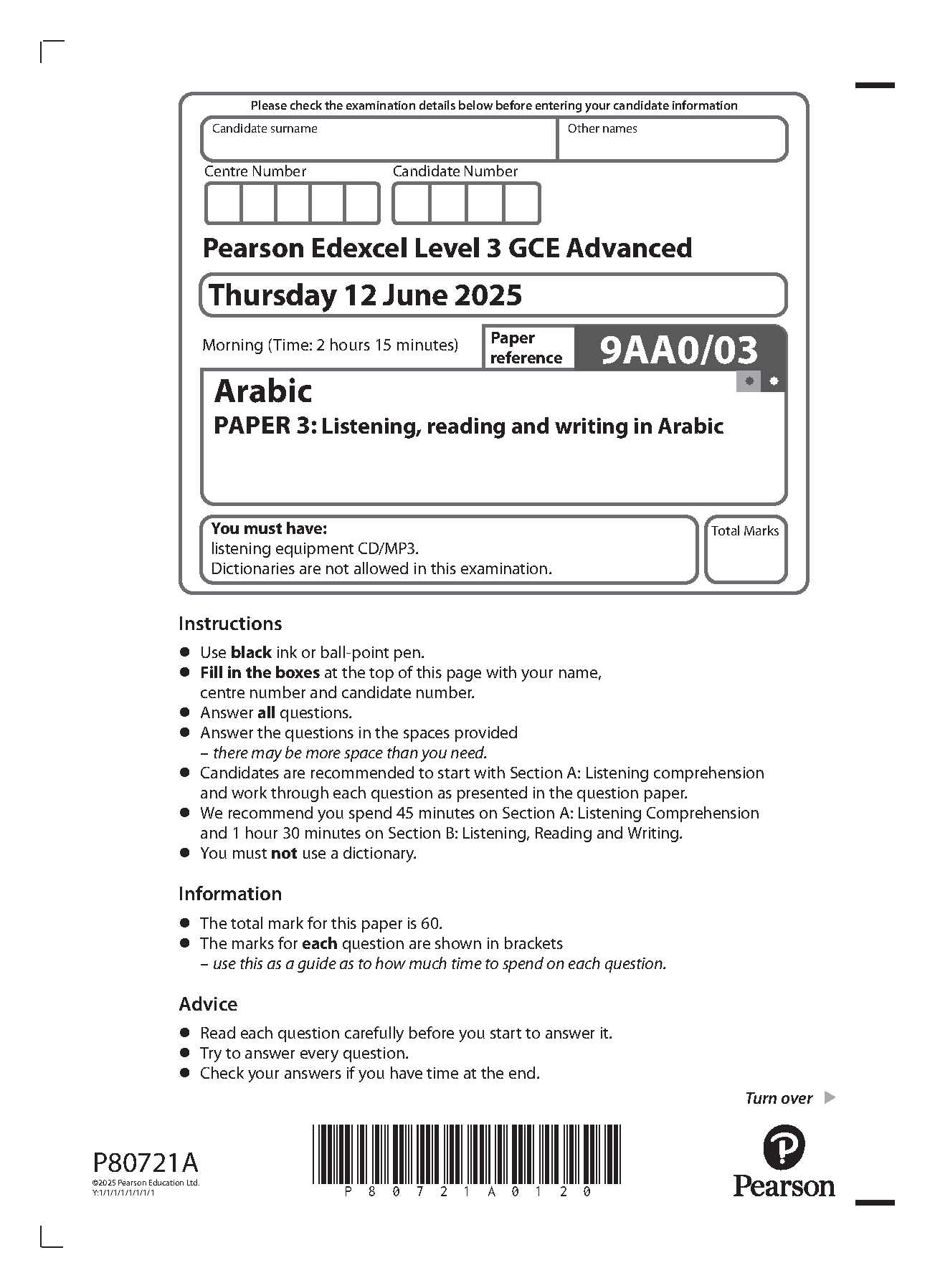 MERGED 2025 Pearson Edexcel A Level Arabic Paper 3 and Mark Scheme (9AA0/03: Listening, reading and writing in Arabic)