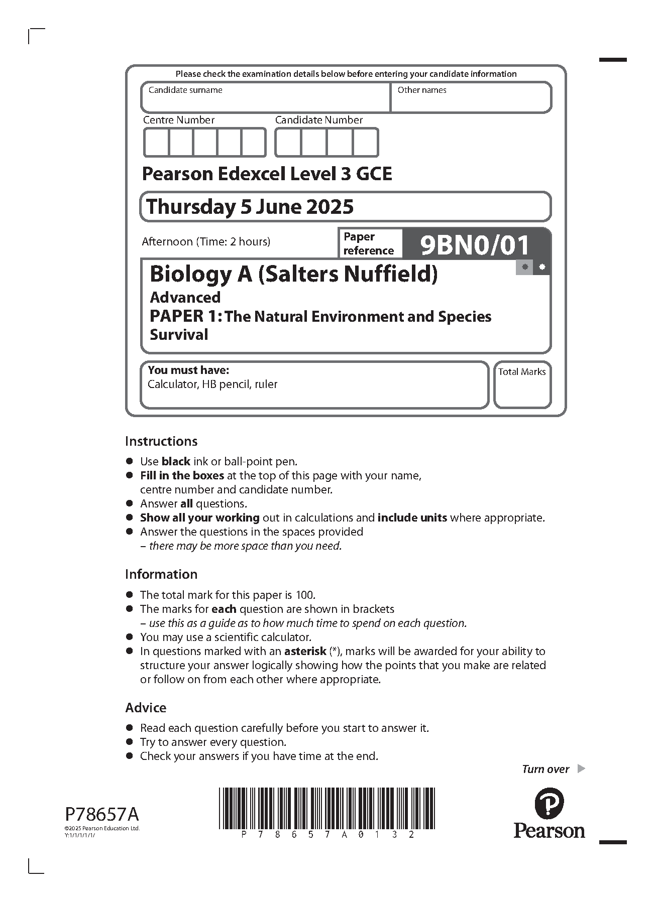 MERGED 2025 Pearson Edexcel A Level Biology A (Salters Nuffield)PAPER 1 and Mark Scheme (9BN0/01: The Natural Environment and Species Survival)